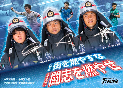 防火防犯に係る各行政団体との協力により、地域の安心安全に向けた啓発ポスターに選手が出演しています。また、高津区ではクラブ職員自身が消防団員となり、消防団協力事業所の認定を受けています。