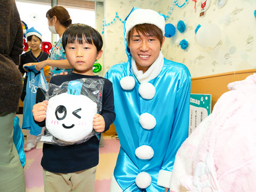 川崎フロンターレの選手が水色のサンタクロースに変身し、小児科病棟を慰問しています。病気と闘っている子ども達に少しでも元気をプレゼントできればと、1997年のクラブ創設時から継続して行っています。