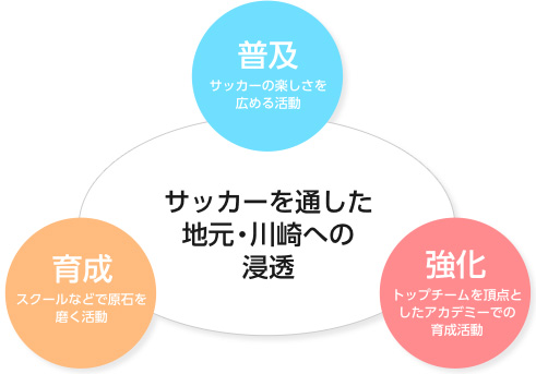 川崎フロンターレアカデミーでは、『FOOTBALL TOGETHER~川崎とともに~』をスローガンに掲げています。「普及」「育成」「強化」の 3部門から、サッカーを通して地元・川崎に根づいていきたいと考えています(下図1)。