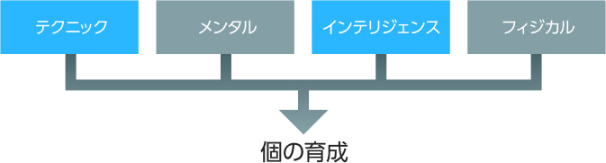 このサッカースタイルを実現し、そしてトップチームへとつなげていくという長期的視野の下、各年代の発育発達に応じて一貫指導を行っています。カテゴリーに応じてテクニック、メンタル、インテリジェンス、フィジカルのそれぞれにフォーカスし、個の育成を進めます(下図2)。