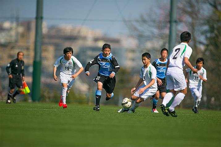 個の成長につながるという意味で、アカデミーでは上のカテゴリーを経験させることを積極的にやっています。ボールの大きさが違ったり体格差があったりするため、ケガをする懸念もあるので、ジュニアの選手をジュニアユースに入れることはしていないのですが、ジュニアユースの選手をユースに混ぜたり、ジュニアユースのカテゴリーのなかで下の学年の選手を上の学年に混ぜたりはします。実際に、現在高校3年生で、中学3年生のときからユースでプレーしている選手もいますし、中学2年生でレギュラーの座を獲得し、3年生と一緒に活躍している選手もいます。