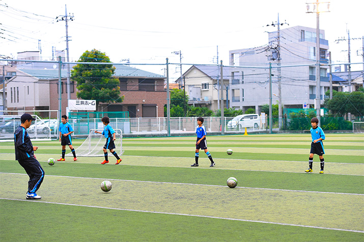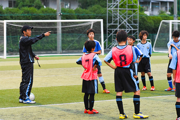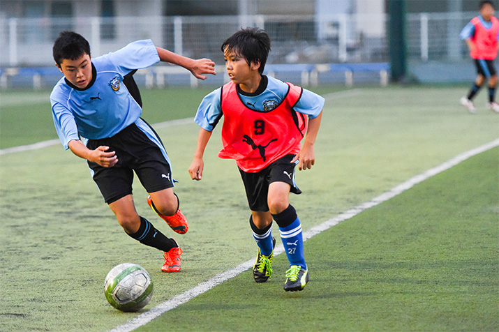 クラブの方向性として、小学生年代ではサッカーの基本的な技術を習得させます。この年代は、背の大きさや足の速さで勝負に勝てることも多いのですが、そうした素質の部分だけに頼っていると、いつか必ず苦しくなってしまうからです。また、早いうちから技術を身に付けておくことによって、選手としての幅が広がり、そのなかでいろいろな駆け引きを覚えることもできます。ところが、自分のプレーに自信をなくし、ボールを持つことをストレスに感じて、すぐに手離したがるようでは、選手としては厳しくなります。