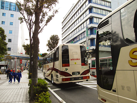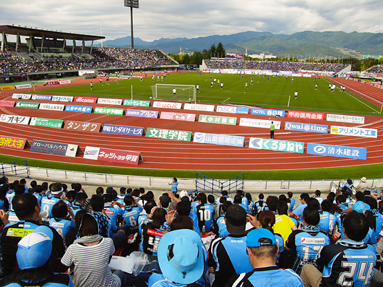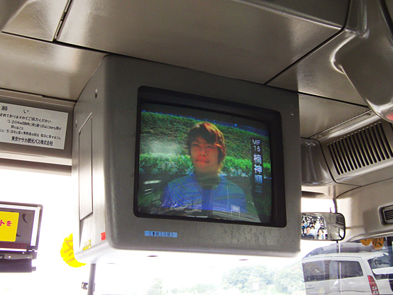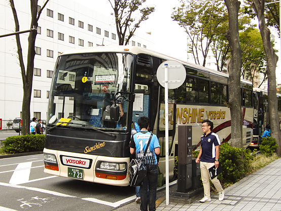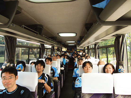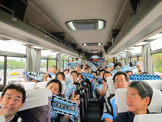 秋の行楽シーズンということもあって渋滞を心配していたのですが、バスはスムーズに山梨県内へ。談合坂SAでの休憩を挟んで、再度山梨中銀スタジアムへ向けて出発します。そして、こちらもアウェイツアー恒例の選手ビデオメッセージを上映。ナビスコカップ横浜FM戦の激闘から中2日、そしてアウェイの地で迎える甲府との一戦に向けて選手たちも気合の入ったコメントを寄せてくれました。最後にはなぜかコージに馬乗りになられるユウの姿… 二人の間に何があったのかはアウェイツアー参加者の皆さんと我々だけの秘密です(笑)