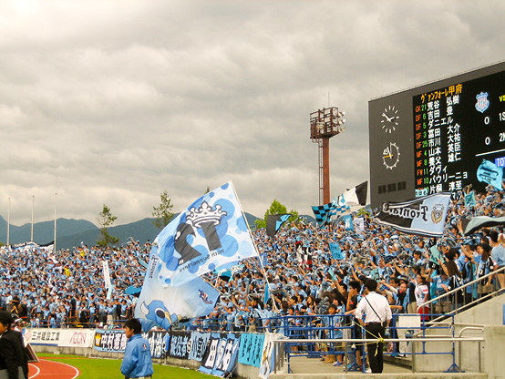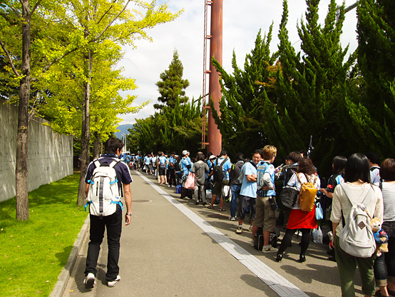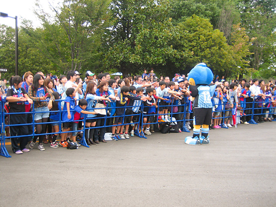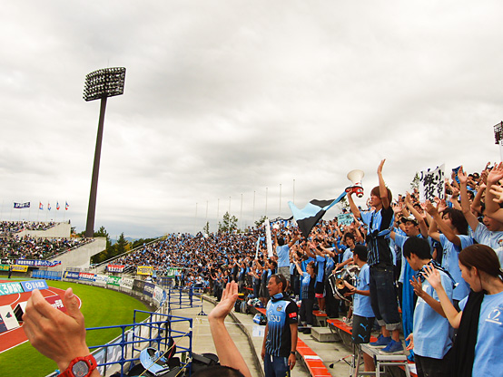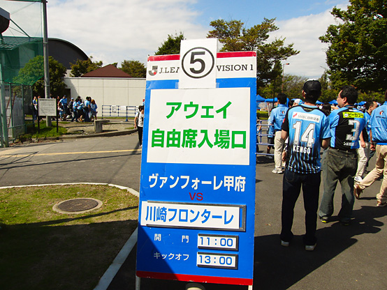 バスは甲府南ICを降りて一般道に入ると、こちらでも渋滞に巻き込まれることはなく、10時半過ぎには山梨中銀スタジアムに到着しました。バスを降りるとすでに電車や自家用車で来たであろうフロンターレサポーターの長蛇の列。せっかくなので、11時の開門にあわせてバスに添乗してきたスタッフでサポーターの皆さんをゲート前でお出迎えすることにしたのですが、待機列がすべてなくなるまでに何と30分以上。本当に多くの皆さんに甲府まで駆けつけていただき、ただただ感謝の気持ちでいっぱいです。