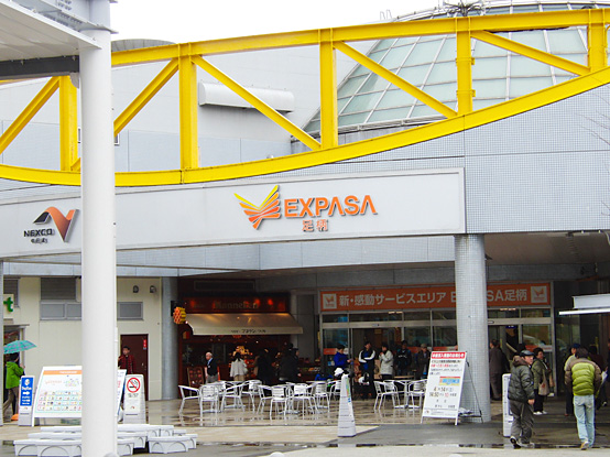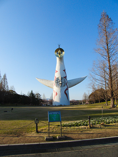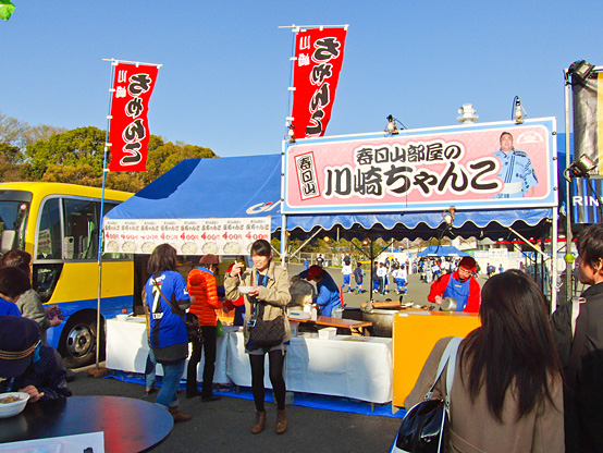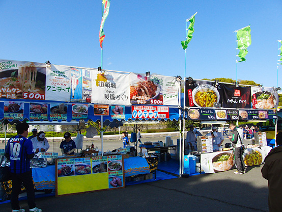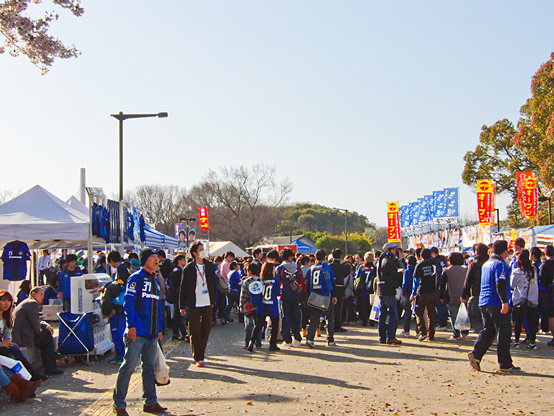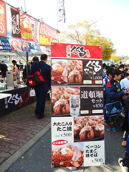 その後は、こちらもアウェイツアー特典の選手コメントVTRや過去の試合映像を見ながら試合へのイメージを高めつつ、バスは西へ西へと向かいます。滋賀県・土山SAでの休憩をはさみ、予定より早く15時40分ごろに万博記念競技場に到着しました。キックオフまでの3時間の間には春日山部屋の川崎ちゃんこも出店した「美味G横丁」でグルメを楽しんだり、太陽の塔を見学するサポーターの姿も見られました。
