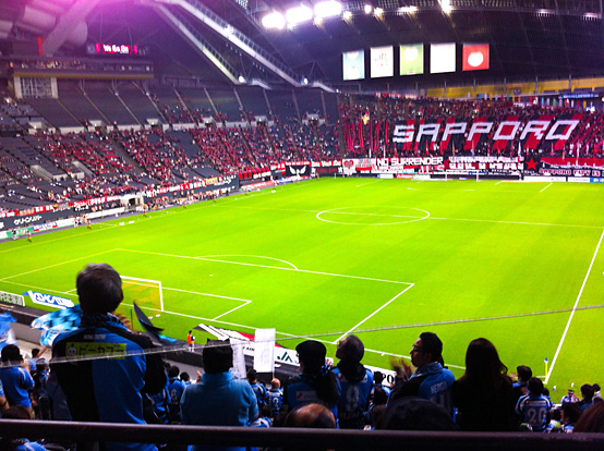 そうこうしているうちに札幌ドームに近付いてきました。ドームでの試合を見るのは皆様初めての方が多かったようで、札幌ドームが見えてきた瞬間歓声が沸いていました。天候に左右されないドームでの試合は応援もかなり響いていました!試合は皆様ご存じのとおり、見事な大逆転劇で勝点3をゲット!帰りのバス車中も大盛り上がりのうちにこの日の宿泊先となる「チサングランド札幌」へ到着し、解散となりました。皆様それぞれ札幌での夜を満喫していただいたようです。