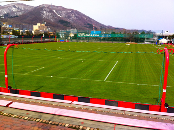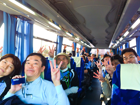 そして約1時間半のフライトの後、新千歳空港に到着!やはり川崎とくらべると少し風が冷たく感じられましたが、天気は晴天!今年のアウェイツアーは毎回天気が悪かったのですが、この日の天気は最高でした。空港を出発し、札幌ドームまでは約1時間の道程。というわけで、急ぎ足で選手コメントビデオの放映とビンゴ大会を開催しました。ビンゴ大会では、普段のアウェイツアーとは一味違った、コムゾーくんのぬいぐるみや鄭大世選手のポスター等、レアな賞品もあり大いに盛り上がりました!