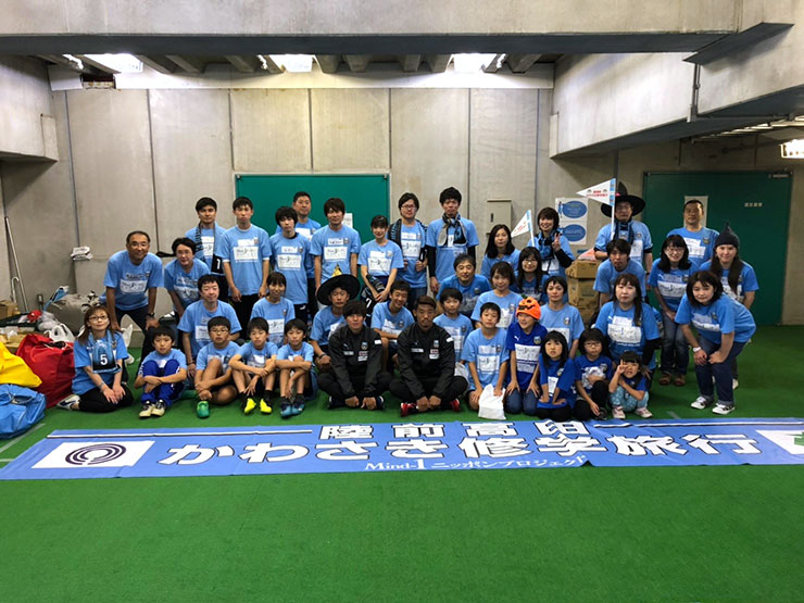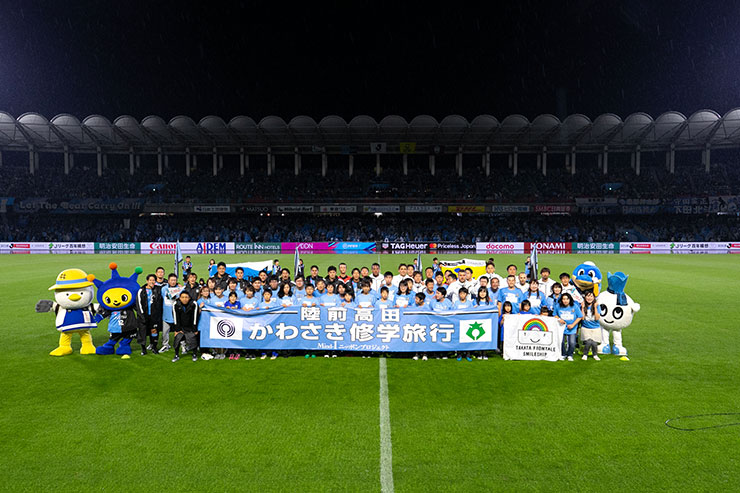 かわさき修学旅行を記念して、両チームの選手たちと記念撮影。当日に何度もリハーサルを重ねて、望んだ本番。雨が降る中でもみなさん、協力していただき、無事に撮影をすることができました。