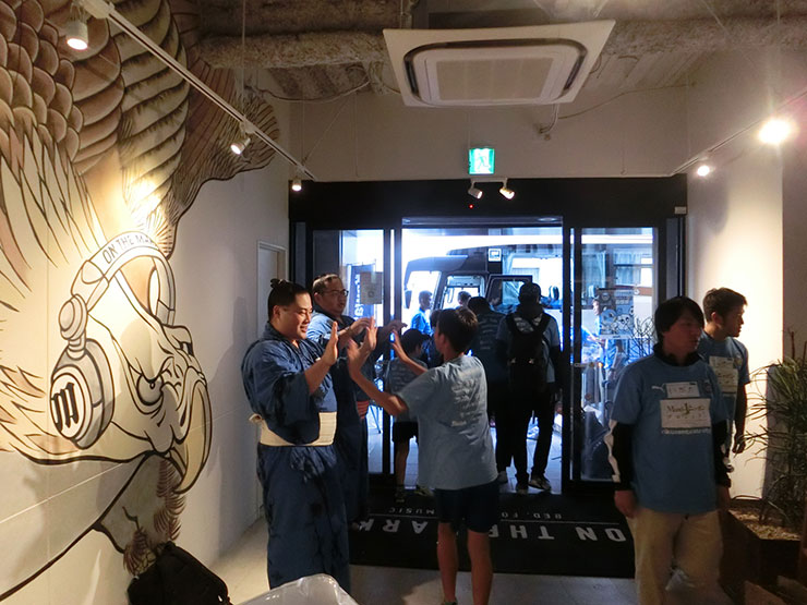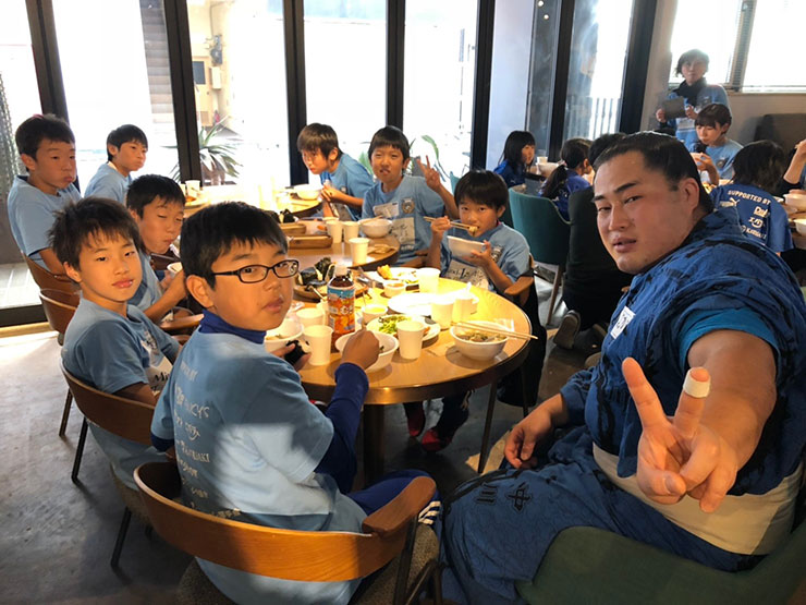 この日のために中川部屋から春日国、義春日の2名に来ていただき、中川部屋のちゃんこを振舞っていただきました。普段、接する機会がない力士に興味津々のみなさん。一緒に食事をとりながらいろんな質問をしていました。食後には、中川部屋から特別にご用意いただいたプレゼントをかけたじゃんけん大会。見事5名のみさなんがプレゼントゲットしました。