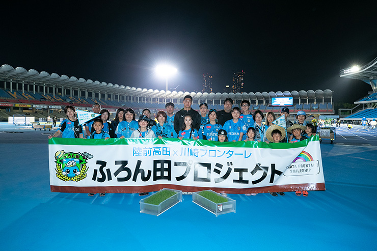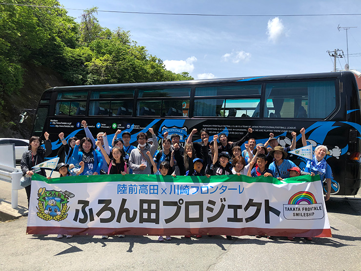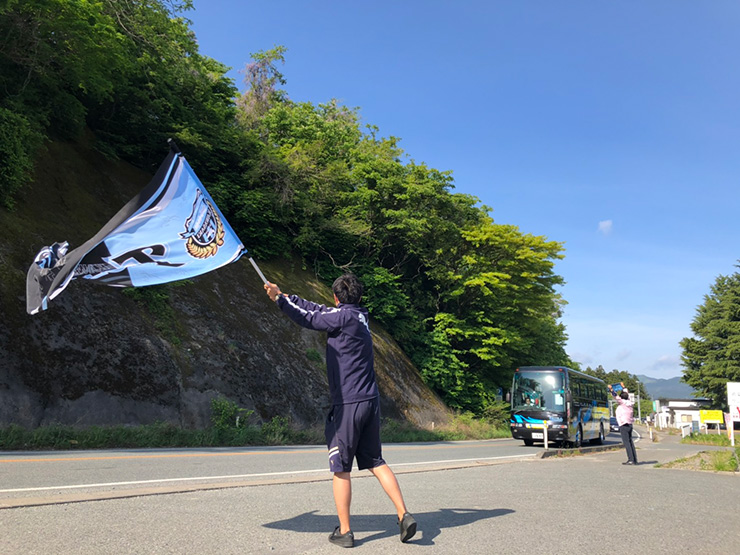 前乗りしていたスタッフが、フロンターレフラッグを振って、無事に陸前高田に到着した一行をお出迎え。試合を置いて1人陸前高田へ前日入りし、「無事にちゃんと到着してきてくれますように…」と夜中も中々寝付けませんでしたが、フロンターレバスを見て本当に安心しました…!