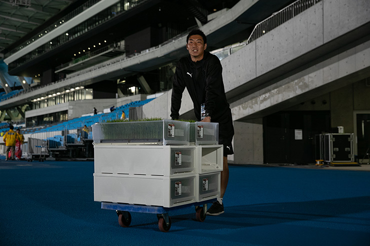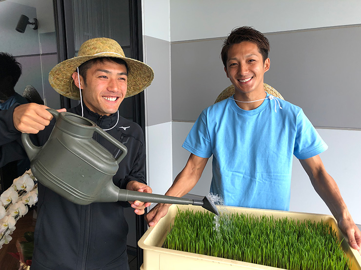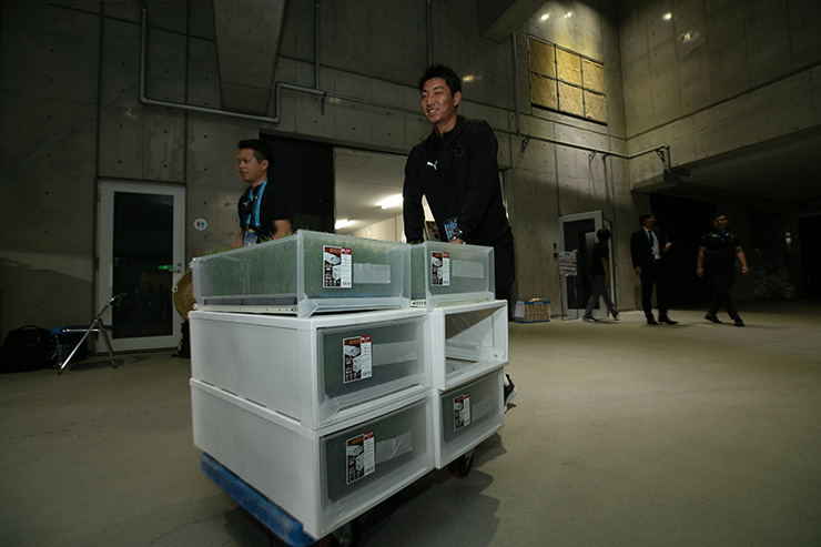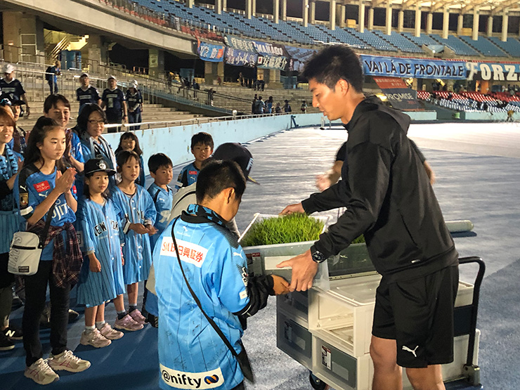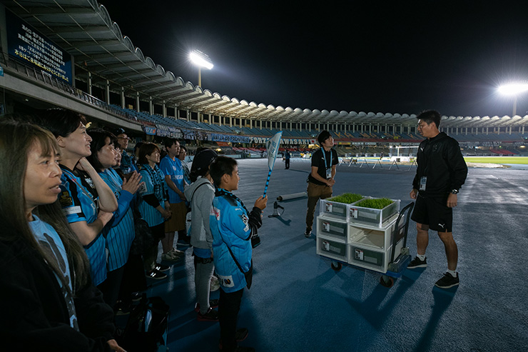 まずは5月17日名古屋戦の夜。激闘の試合後でしたが、疲れも見せずに、これから始まる未知のツアーへの期待が溢れ出ていたツアー参加者の皆さん。出発前には、選手が毎日水やりをして大事に育てた苗の引き渡しセレモニーを行いました。選手を代表してアンちゃんがセレモニーに参加。台車に積まれた苗をそーっと押しながら登場すると、その姿に、なぜか参加者の皆さんから笑いがこぼれました。