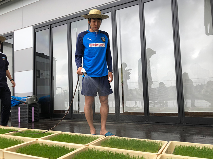 早速、アンちゃんからひと言。「残念ながら選手たちは行けませんが、僕らが大切に育てた苗をみなさんに託すので、大切に田植をしてきてください!!」と苗に選手たちの想いのせて、参加者に手渡していました。