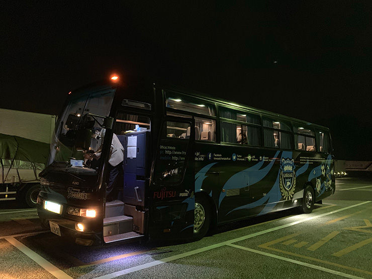 そして、いよいよ等々力を出発。等々力で業務をしていたフロンターレスタッフもバスのお見送りに!! 車内では早速、スタッフ、参加者の自己紹介がスタートしました。フロサポ歴、好きなご飯のお供やツアー参加の動機などを話していただきました。「旧選手バスに乗れるから」、「過酷なバスツアーだから(笑)」。日付を超えていたにも関わらず、車内には笑いが溢れていました。