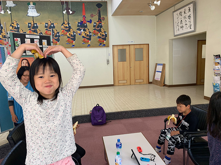 お昼の移動までの束の間の休憩でしたが、バスの中でぐっすり寝ていた子どもたちは元気一杯! 朝食には、Doleさんのバナナを頬張っていました。