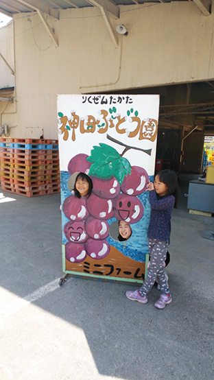 バナナを食べた後はみんなでお散歩に。10分程歩くと陸前高田ランドでもお馴染みの「神田葡萄園」さんがあり、お邪魔しました。美味しい「マスカットサイダー」を飲んで笑顔いっぱいな子どもたち。仮眠を終えた大人も集合し、「神田葡萄園」はフロンターレサポーターで賑わっていました。昼食移動前には、選手バス前で記念撮影。皆さん笑顔で、行きのバスの疲れはすっかり取れたようです。