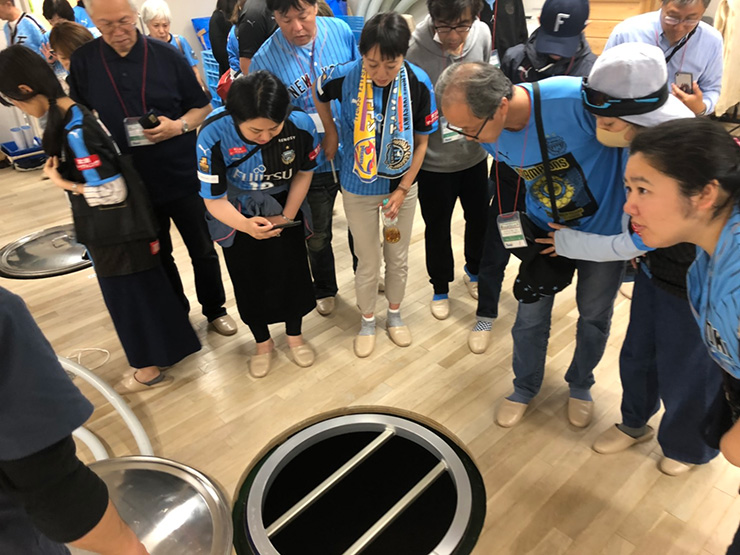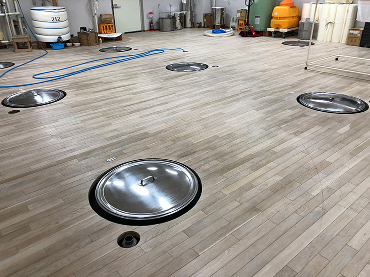 その後、大船渡へ移動し、陸前高田ランドでも大人気の「酔仙酒造」さんの酒蔵を見学。大船渡の街中からは少し離れ、周りを山が囲む自然豊かな所までバスが移動していくので、「本当にここに酒蔵があるの?」と思いましたが、自然豊かで水がきれいな場所だからこそ、美味しいお酒が出来ると聞き納得。酒蔵は珍しいフラット式の構造となっており、皆さん床を覗き込んで興味津々のようでした。