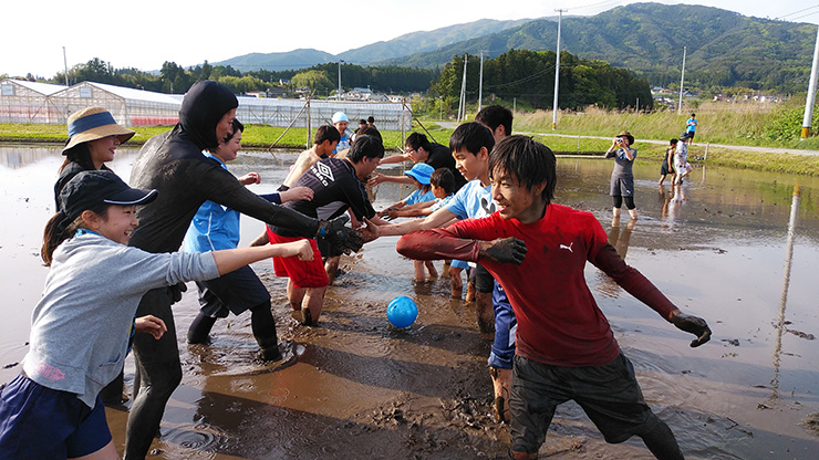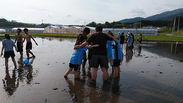 午前中に部活の練習を終えたあと、すぐに田んぼに来てPKの練習をしていたようです。頭から足先まで本当に全身泥んこまみれだったので、彼らを見た参加者は「え? 自分たちもこんなに汚れるの?」と明らかに顔色が曇ったのは言うまでもありません(笑)