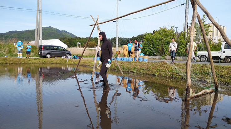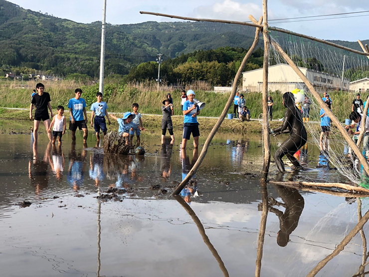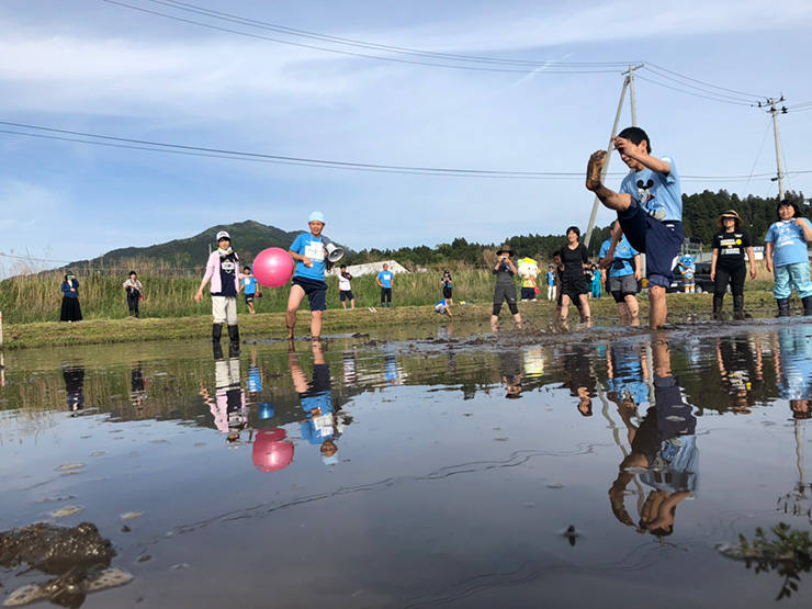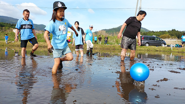 汚れてもいい服装に着替え、PK対決がスタート。最初に田んぼの中に入るときこそ、皆さん悲鳴をあげながら恐る恐る歩いていましたが、次第に慣れてくるとこの「ヌメッ!」とした感じが気持ちよくなってきます。元気一杯な子どもたちも、最後には走り回っていましたよ。