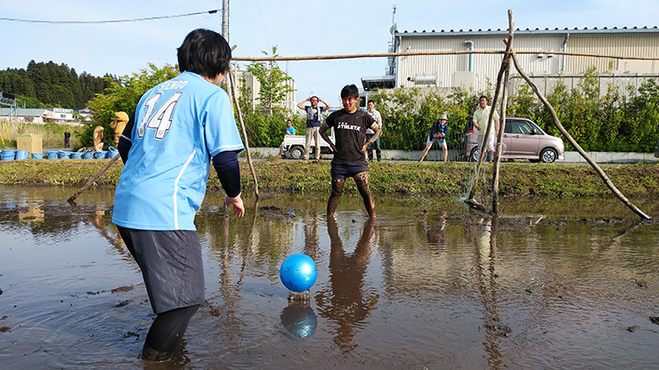 今回のPK対決はツアー参加者、陸前高田市の職員、高田高校サッカー部がそれぞれ混合チームとなり、4チームでのトーナメント方式で実施。この対決の面白いところは「サッカー経験」や「運動神経」がほとんど関係ないということ。ピッチコンディションならぬ、田んぼコンディションの影響で、とにかくボールが蹴りにくいんです。