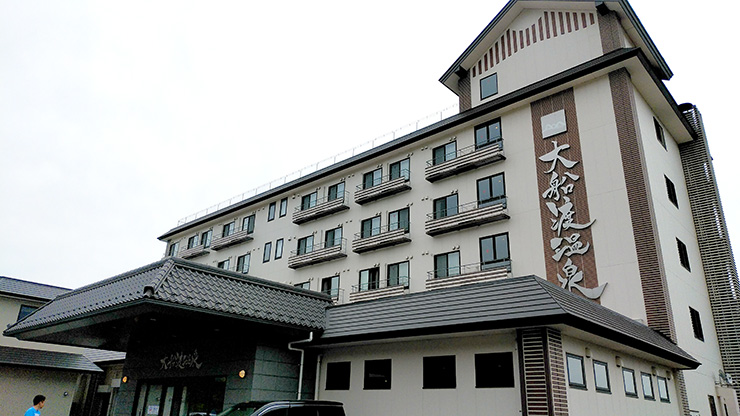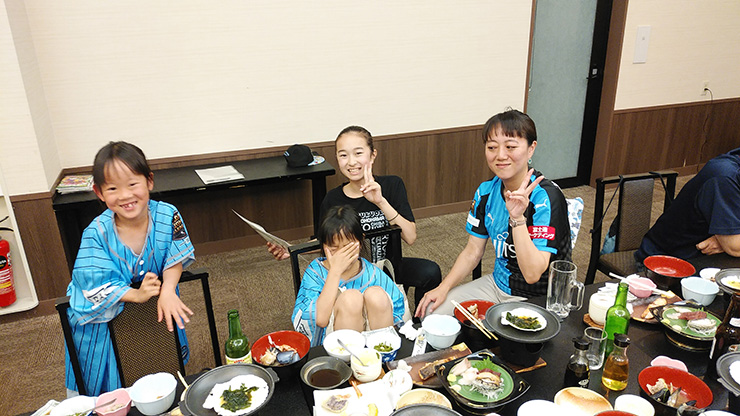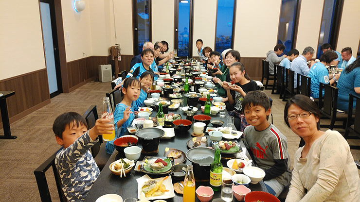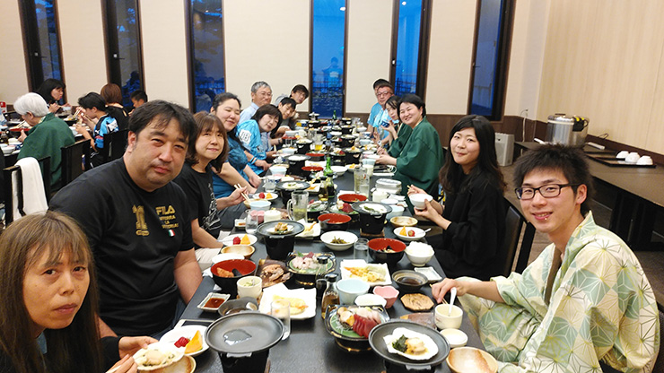 名古屋戦終了後からの夜行バスやどろんこPKなど、長旅の英気を養うのは、土曜夜の宿泊施設「大船渡温泉」です。大船渡の海沿いの崖の上に位置し、オーシャンビューの絶景が楽しめるホテル。夕方にホテルに到着し、温泉でさっぱりした後お待ちかね夕食です。