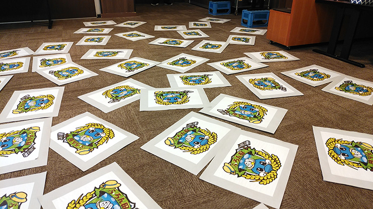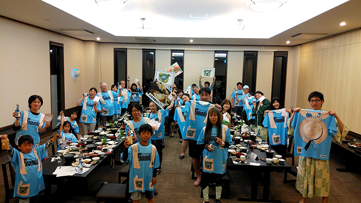 看板が完成した後は隣の営農センターへ移動し、「創作おにぎり選手権」が開催されました!「たかたのゆめ」のお米とのりを使って、ふろん太とゆめちゃんの顔をデザインするイベントだったのですが、皆さん立体にしたり可愛くデザインしたりとかなりハイレベルな闘いに!非常に盛り上がりを見せた後は、地元の皆さんが作っていただいた豚汁と一緒におにぎりをいただきました。