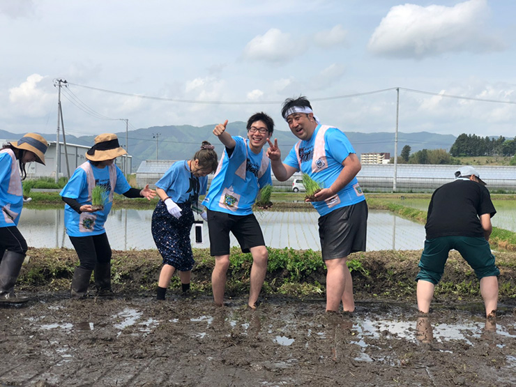 そして現地「ふろん田」に到着し、天気は最高の田植え日和!限定の特製Tシャツに身を包んだ一行は、まずは地元の方々と一緒に陸前高田市主催の田植え式に出席。