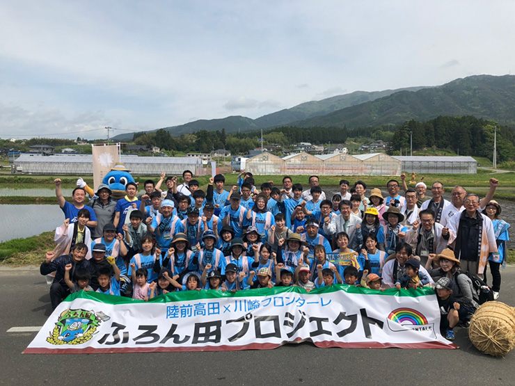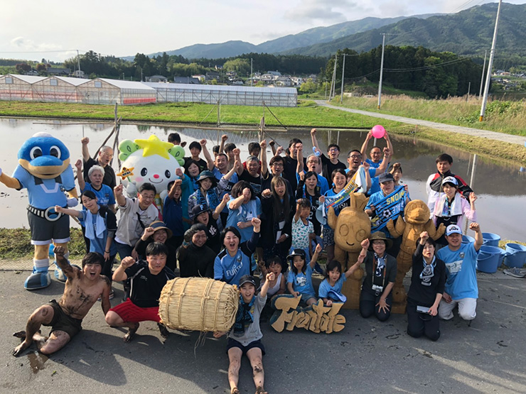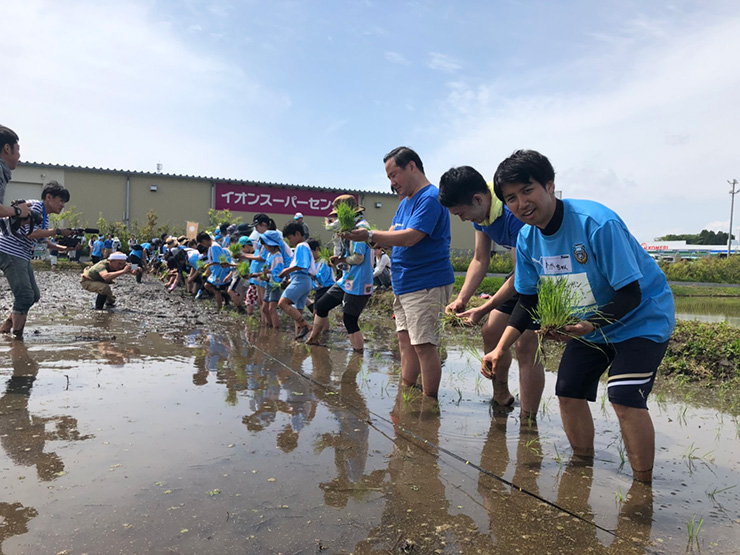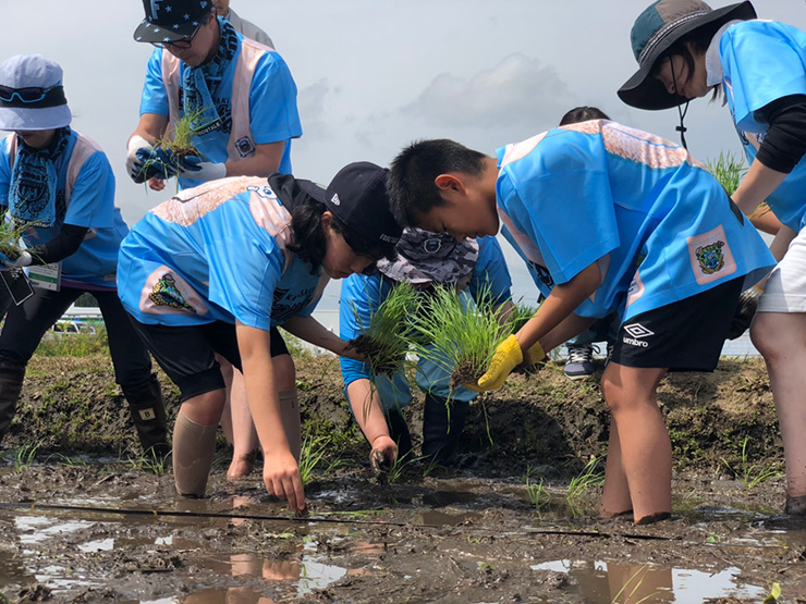 最初はおぼつかない手つきの様子だった参加者の皆さんも、植えては一歩前へを繰り返すうちに、余裕から笑顔が増えていきました。そして、どこからかチャントの大合唱! フロンターレのチャントを歌いながらの田植えは世界初(?)でしたね!