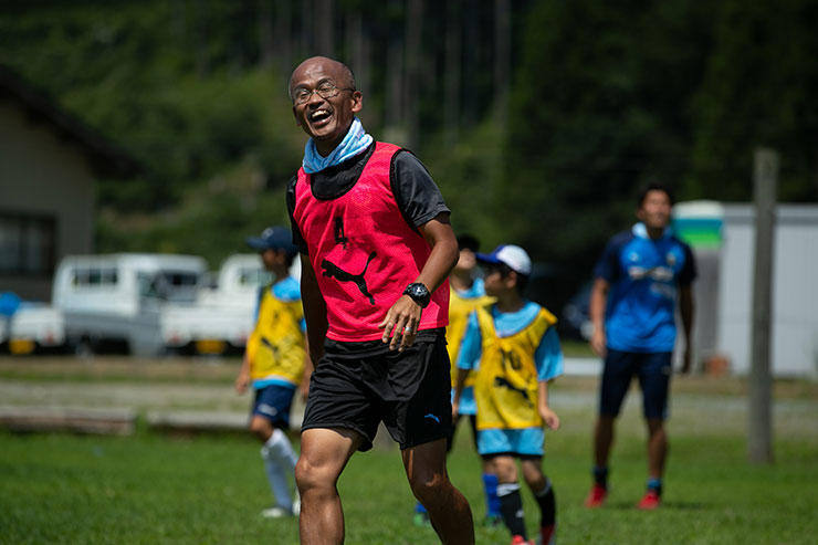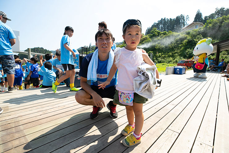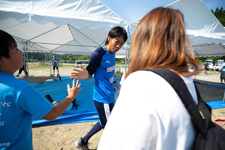 前日の試合の疲れはどこ吹く風かのように、子ども達から元気をもらって笑いながら走っていました。
