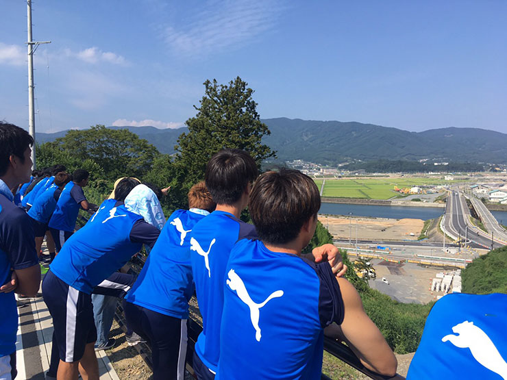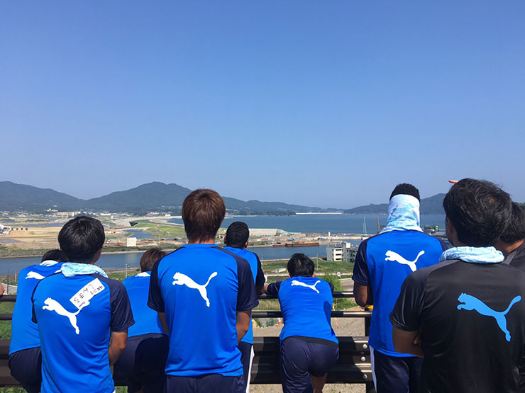 選手達はホテルに戻る途中に市内を見渡せる高台で、バスから降り、現在の街並みの様子を見ながら当時の津波が襲った街の状況も聞いていました。その後、過去にサッカー教室を開催したこともあった高田小学校へ。