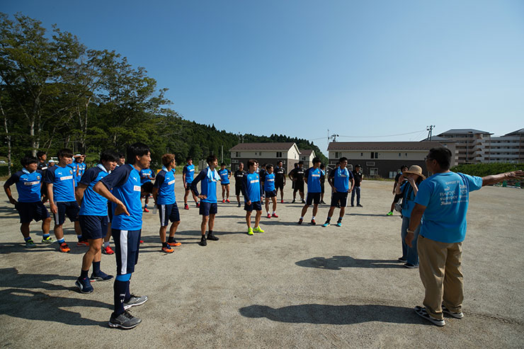 講話については主に新加入選手などの初めて陸前高田に訪れた選手達が参加し、陸前高田とのきっかけが生まれた濱口先生から震災当時の状況・現在の陸前高田について講話をしていただきました。整備されてきている街並みからは想像できない当時の状況を知り、選手達は真剣な様子で説明を聞いていました。