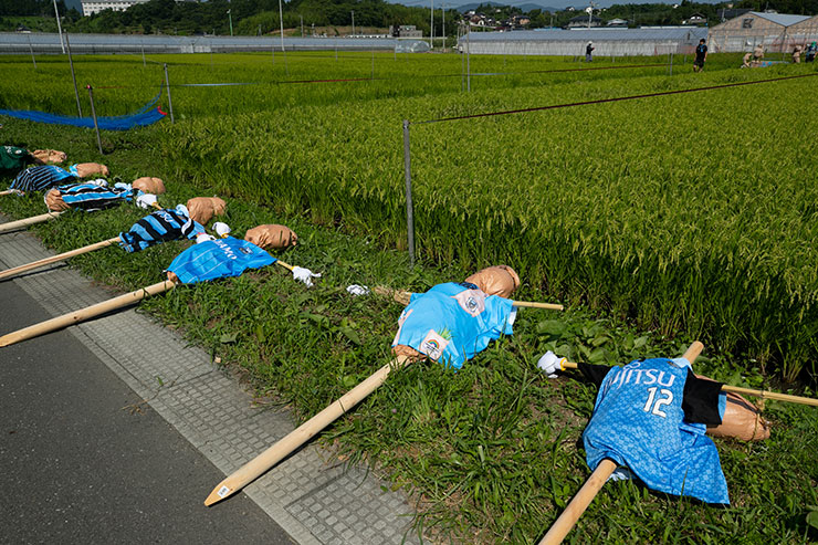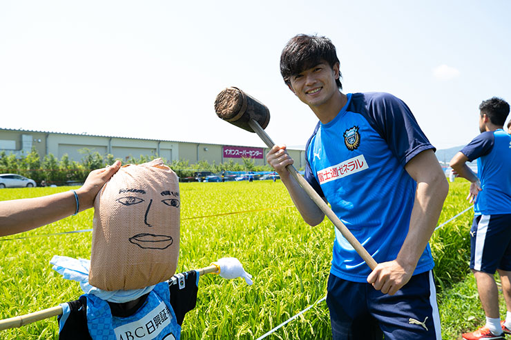 9月の収穫に向けて5月に田植えをした当初よりもしっかりと育ち、実もできはじめ、緑一面に囲まれた田んぼを見ると非常に感慨深くなりました。選手達にも事前に苗を麻生グラウンドで育ててもらい、今回はかかし作り、ネット張り、テープ張り作業を各班に分かれて活動を行いました!