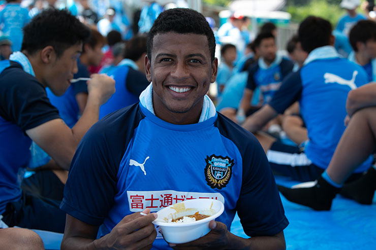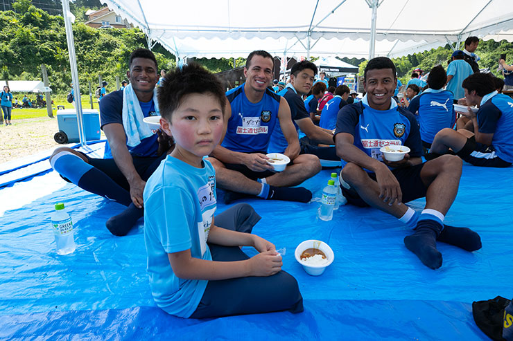選手達と子ども達が一緒に食べて交流し、サッカーをした後のカレーはあっという間にペロリ! 大人も子ども大好きなカレーは「おかわりありますか?」と来る選手達もいるほどで、参加した子ども達以外にも保護者の方々や関係者の皆さんも合わせて用意した200人分は完食でした!