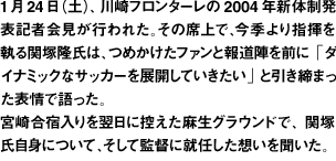 関塚 そうですね。ただ、攻撃にいくときはいっていいと思うんです。それを味方の選手がカバーする。中途半端なサッカーはしてほしくないと思うし、その辺のダイナミックさは出してほしい。ゴール前で迫力のあるサッカーをしたいなと思っています。 ──昇格という大きい目標がありますが、監督自身が必要だと思っていることは。 関塚 細かいところから勝負にこだわること、自分が決めたことをやり通すことです。また、トレーニングから100パーセント集中してやっていくことがすごく大事だし、それが結果につながると信じています。あとは、一人ひとりがチームを信じて、味方を信じて、チームの団結力がもてれば、結果はおのずと転がりこんでくると思います。 ──さて、ご家族は川崎に。 関塚 今年、早々に引っ越しました。 ──お子さんは。 関塚 長女が小学4年、長男が小学1年で、こちらの学校に通っています。 ──サッカーを離れてご家族で過ごされるときは、“よきパパ”で。 関塚 いやあ、“パパ”じゃなくて“お父さん”ですけどね(笑)。子どもが小さいので、家族といる時間は大事にしたいですけどね。もう少ししたら、友だちとワーッて遊びにいっちゃうでしょうから(笑)。 ──記者発表にはたくさんのファンの方が足を運んでくれましたが、いかがでしたか? 関塚 監督としての記者発表は初めてで、ましてや(ファンの方を前にした)ああいう形だったので緊張しました(笑)。 ──では、最後にファンのみなさんにメッセージをお願いします。 関塚 ファンの皆さんが期待しているのはJ1昇格。それに向けて自分のできること、しなきゃいけないことをしっかり整理してキャンプから一人ひとり1年間、戦える体を作り、J1昇格に向け1試合1試合、戦えるチームづくりをしていきます。開幕からぜひスタジアムに足を運んでいただきたいと思います。よろしくお願いします! |