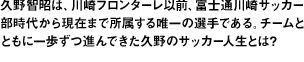 1996年に富士通に入社した久野は、まさにチームの歩みとともに進んできた選手である。入社当時は、午前中に会社に出社し、午後から練習という日もあったが、ちょうどプロ化に向けて動き出した時期でもあり、サッカー中心の生活を送るまで時間はかからなかった。翌1997年には川崎フロンターレとしてスタートを切り、Jリーグからも十数人の選手が移籍。この年、社員選手たちはなかなか出番に恵まれず久野は3試合のみの出場に終わった。結局、97年は、勝ち点1差で昇格を逃し、翌98年には伝説の参入決定戦で涙を呑んだ。