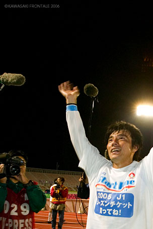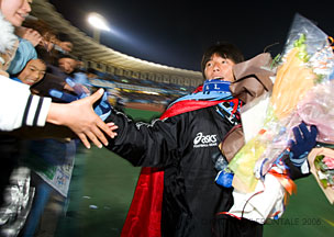 | 「やりきった、という気持ちです。最後は、攻めあがって点を取ろうかとも思いましたが(笑)、僕は、そういうタイプの選手じゃない。しっかり最後まで自分の役割を果たそう、と思ってプレーしました」と試合後に記者に囲まれて、スッキリした表情で語った。 試合が終わり、ゴール裏のサポーターに応え、それからロッカールームに戻る途中、やまない相馬コールに、何度も振り返り手を振って深くおじぎをした。 そうして、ピッチから続く階段を少し下りたところで止まり、もう一度振り返って階段を上って、サポーターに姿をみせ、やっぱり両手を振って最後に深くおじぎをした。 相馬直樹らしい、終わり方だった。