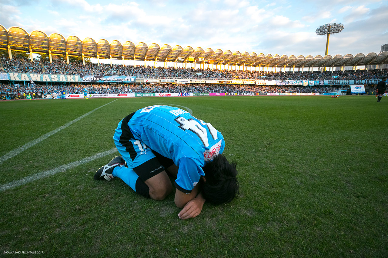 川崎でプロのキャリアをスタートして15年、チームの看板を背負って立つゲームメーカーであり続ける。2016年Jリーグ最優秀選手賞を獲得。得点とアシストという結果に直結するそのプレーにはいささかの足踏みもない。2017年12月、宿願だった初タイトルのシャーレ(フロ桶)を大粒の涙と共に等々力で掲げた。