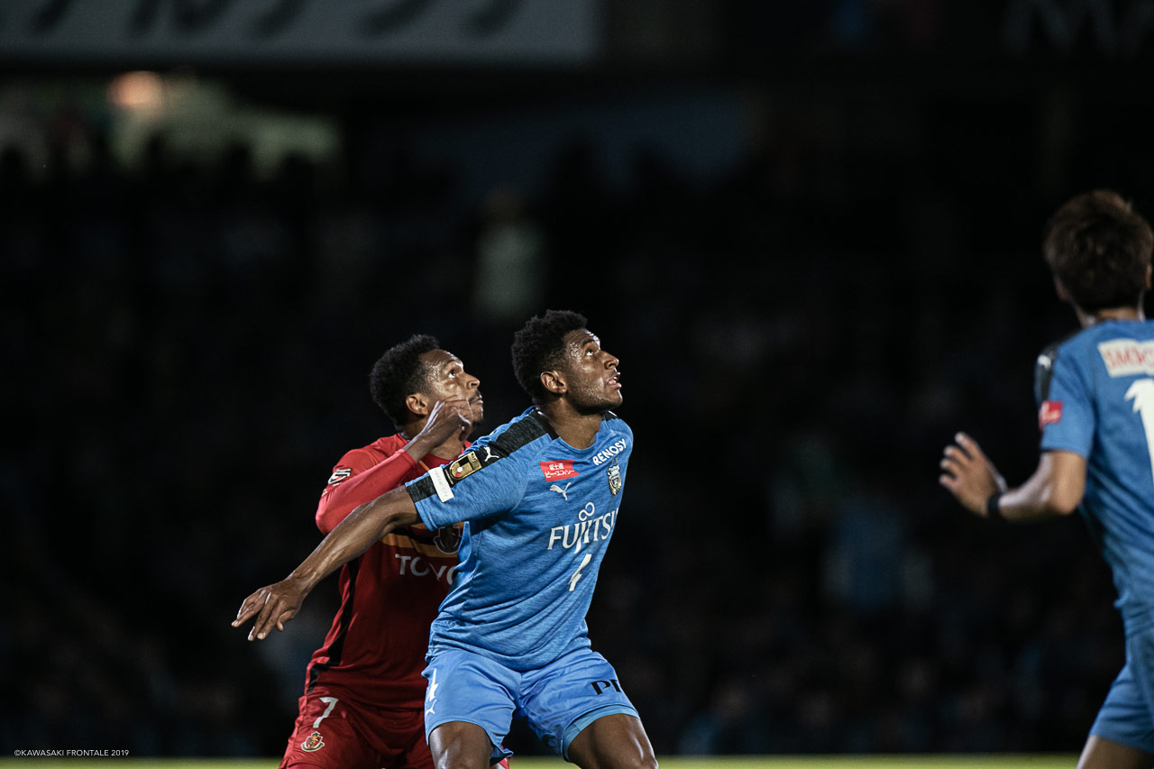 13分、川崎フロンターレが先制点を奪うことに成功する。相手陣内でボールを奪うと中盤でボールをつなぎ、脇坂泰斗のラストパスが小林悠に。左足で鮮やかにシュートを決めて、ゴールネットを揺らした。ジェジエウは喜びを爆発させた。