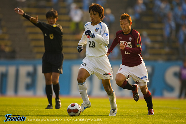スターティングメンバーは、2トップにジュニーニョとテセ、中盤は右に中村、左に谷口、三角形の底に河村、右アウトサイドに森、左に村上、最終ラインは伊藤-寺田-箕輪の3バック、GK川島。立ち上がり1分、いきなりフロンターレが先制点を挙げる。スローインの流れからテセが左サイドから大きくサイドチェンジ。このボールが右サイドの森に渡り、森が遠めからおもいきってミドルシュート。これがゴール左ポストに当たり、ゴールへと吸い込まれる。(1-0) 神戸も反撃。3分、古賀の右コーナーキックにエメルソン・トーメがヘッドで合わせるが、シュートはゴール右へ外れる。4分には最終ライン裏へのロングボールが前線の大久保に入るが、寺田と伊藤で挟み込んでカバー。7分、フロンターレのチャンス。ダイレクトでパスをつなぎ、中村が相手に倒されながらもスルーパスを前線へ。このこぼれ球を拾ったジュニーニョが右サイドから折り返し、ゴール前に中村みずから走り込みダイレクトで左足を合わせるが、このシュートは惜しくも相手DFにブロックされる。シンプルにタテにボールを入れてくる神戸。9分、浮かし球が裏のスペースに入りここに田中が走り込むが、マークについていた中村がしっかりとケア。フロンターレが攻撃にかかったときにカウンターを狙われるが、落ち着いて対応。18分、神戸の攻撃。左サイドから崩しをかけられゴール前で連続シュートを打たれるが、最終ライン+河村でシュートブロック。ピンチをしのぐ。サイドを使って押し込むフロンターレ、スキを狙ってテンポの速い攻撃をかける神戸。中盤で激しいボールの奪い合いが続く。すると29分、神戸のコーナーキックをテセがクリアし、このボールを拾った村上がボッティからファールを受け、このプレーでボッティが2枚目のイエローカードを出されて退場処分に。フロンターレが数的優位な状況に変わる。するとそのタイミングを見逃さずにフロンターレが攻撃。31分、自陣から絵に描いたようなカウンターを繰り出し、中央のジュニーニョからボールを受けた中村が右サイドから絶妙のアーリークロスをゴール前へ。ここにテセがフリーで走り込み落ち着いて頭で合わせて追加点を挙げる。(2-0) さらに35分、村上のサイドチェンジのボールを受けた中村が右サイドからスルーパス。このボールに走り込んだジュニーニョがダイレクトで折り返し。ゴール前に走り込んだテセがなんなく合わせ、集中攻撃で3点差に突き放す。(3-0) 39分、中村からボールを受けた村上が左サイドからクロスを入れ、テセがヘディングシュートを放つが相手GKがセーブ、さらにこぼれ球を森が頭で押し込むが、ここもGKの好セーブに阻まれる。神戸も反撃。44分、左サイドを崩され、近藤の左サイドからの折り返しを受けた大久保が決定的なシュートを放つが、ここに寺田がスライディングに入りブロック。ピンチをしのぐ。森の先制弾で試合の主導権を握った上に、相手の退場で一気に勢いに乗ったフロンターレ。3-0で前半を折り返した。