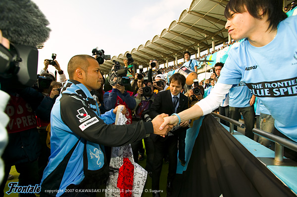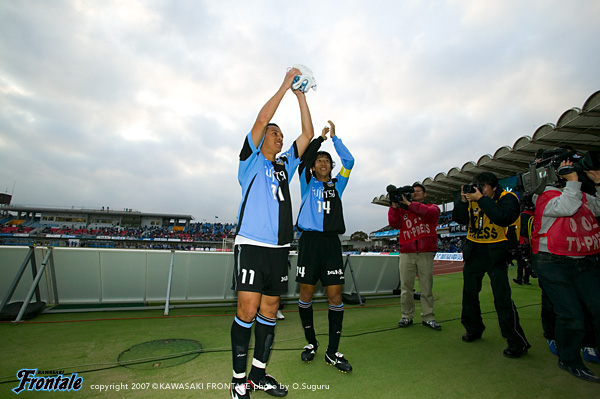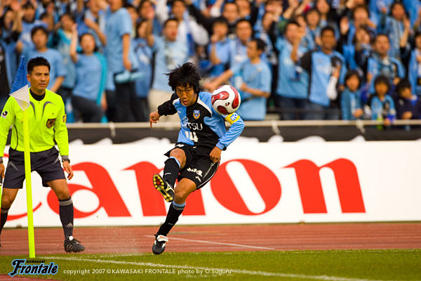 ハーフタイムのロッカールーム。「良いバランスでサッカーがやれている。このまま自信を持ってやっていこう!後半も立ちが上がりから攻守のバランスを意識するように」と関塚監督が選手たちに指示。新加入の村上も「もっともっと走って絶対に足を止めるな!1対1で絶対に負けないようにいこう」と声を上げる。気持ちを引き締めてピッチへと出て行く選手たち。後半立ち上がり、先に仕掛けたのは鹿島。中盤より前に人数を置いて積極的な攻撃をしかけて連続でコーナーキックを得るが、ここはディフェンス陣が集中を切らさず守り抜く。49分、フロンターレの攻撃。森のスローインを谷口がダイレクトでスルーパス。スペースに抜け出したマギヌンが右サイドからクロスを入れるが、我那覇には届かず惜しくもクリアされる。53分には中村の絶妙のスルーパスに我那覇が反応。ゴール前に走り込みシュートを放つが、GKの飛び出しに阻まれゴールならず。さらに55分、中村とジュニーニョの細かいコンビネーションプレーからGKの目の前まで迫るが、中村のラストパスはゴール前で鹿島DFがクリア。56分、この試合最大のピンチの場面。鹿島の左サイドからのフリーキックにゴール前のダニーロがヘッドで合わせるが、ボールは左ポストを直撃し、こぼれ球は谷口が懸命にクリア。鹿島の攻勢をしのぎ切る。58分、フロンターレの攻撃。ジュニーニョが単独で突破を仕掛けてDFをごぼう抜き。一気にシュートまで持ち込むが、ここもGKの好守に阻まれてしまう。シンプルかつ速いサッカーでお互いのゴール前を行き来する激しい攻防が繰り広げられる。63分、中村のスルーパスにジュニーニョが走り込み、右サイドからシュート。しかし、ここもGKが好セーブ。攻め込みながら、どうしても追加点を奪うことができない。64分、鹿島のカウンター。コーナーキックのクリアボールを拾われ、一気にフロンターレ陣内へと迫られる。しかし、ここは伊藤がゴール前でラストパスに足を出してクリア。66分にもコーナーキックのルーズボールを拾われてカウンターを招くが、いち早く戻った谷口が自陣でクリア。ピンチをしのぐ。メンバーを同時に2人入れ替え、3トップ気味の布陣でさらにプレッシャーをかける鹿島。だがフロンターレがボールを奪うことができれば、即チャンスにつながる。73分、76分と、カウンターアタックで自陣から一気に鹿島陣内へと迫るが、GKの好守に阻まれ追加点ならず。迎えた81分、ジュニーニョの突破に耐え切れずに岩政がこの試合2枚目のイエローを受け、退場処分に。数的不利ながら最後の総攻撃を仕掛ける鹿島だが、11人が連動して粘り強く守り抜くフロンターレ。終了間際には西山とテセが投入される。ロスタイムも危なげないサッカーでしのぎ、1-0のままタイムアップ。