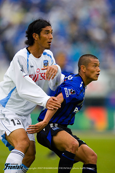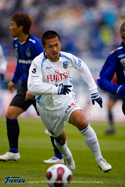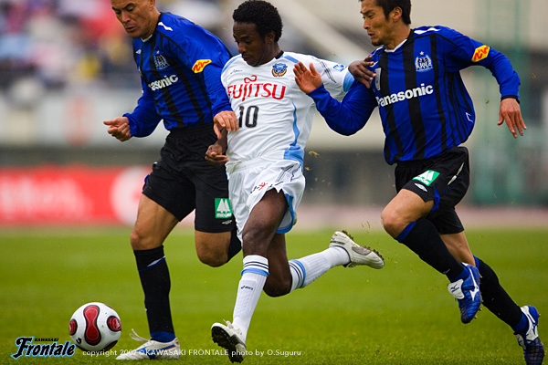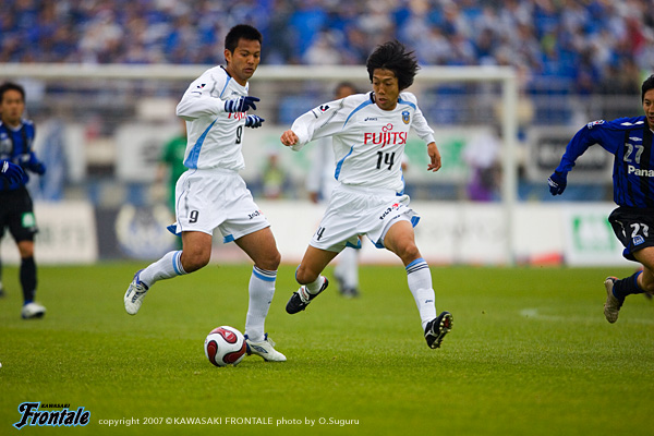 立ち上がりから仕掛けたのはG大阪。1分、タテパスにマグノ・アウベスと播戸が走りこむが、箕輪がマグノ・アウベスのシュートをブロック。対するフロンターレも2分、川島のパントキックをマギヌンが頭ですらし、ボールを受けたジュニーニョがミドルシュートを放つが、これはゴール上へと外れる。相手の攻撃力を警戒してか、焦らずボールを回して様子を伺う両チーム。中盤でのつぶしあいが続く11分、中村がジュニーニョとワンツーを決めてエリア内に走りこむが、ここはDFにつぶされる。さらに12分、我那覇からボールを受けたマギヌンがボールを右に流れた中村にはたいてみずからゴールに迫るが、シュートは相手DFにブロックされてしまう。しかし迎えた13分、右サイドで森が単独突破で3人をひきつけながらクロスを中央へ。ゴール前の混戦からこぼれ出たボールに詰めたのは、ひさびさのスタメン出場の谷口。バイタルエリア前から放った意表を突いたループシュートがゴール左上へと吸い込まれた。(1-0) 先制点を奪ったものの、試合の流れは一進一退。G大阪はマグノ・アウベス、播戸の2トップがフロンターレの最終ラインの裏を狙う。24分、G大阪の攻撃。FWがおとりになって空いたスペースに2列目から二川が走りこむが、GK川島が果敢に飛び出し交錯。こぼれ球をマグノ・アウベスが押し込むが、その前のプレーが二川のファールでゴールは認められず。ことなきを得る。27分にもG大阪はセットプレーの流れから攻勢をかけるが、伊藤-寺田-箕輪の最終ラインが、ゴール前で粘り強くゴールを守り抜く。試合は徐々にG大阪がボールを支配し、フロンターレがカウンターのチャンスを狙う展開へ。迎えた38分、G大阪は連続コーナーキックからセカンドボールを拾って分厚い攻撃。フロンターレの最終ラインが下がったところで、ボールはバイタルエリアへ。ここに走りこんだ明神がミドルシュートを放ち、同点に追いつかれてしまう。(1-1) しかし、フロンターレもすぐさま反撃。41分、中村が絶妙の浮かし球をG大阪の最終ラインとGKの間へ。ここにマギヌンがタイミングよく走りこみ、相手GKより早くボールに触ってゴールへと流しこみ、勝ち越し弾を決める。(2-1) お互いのストロングポイントを警戒しながら、チャンスと見ると積極的に攻撃を仕掛ける緊迫した展開。決定機をものにしたフロンターレが2-1でリードして前半を折り返した。