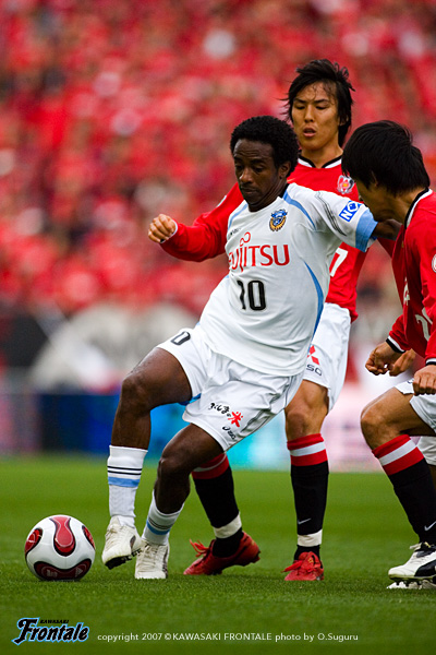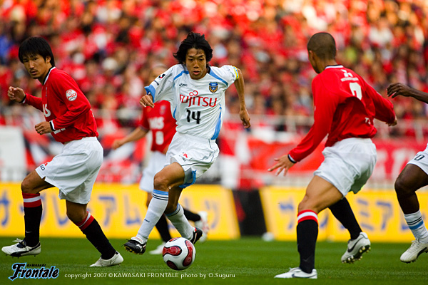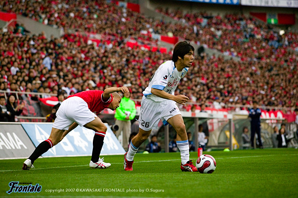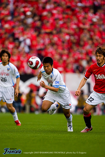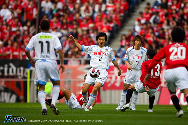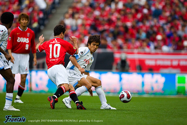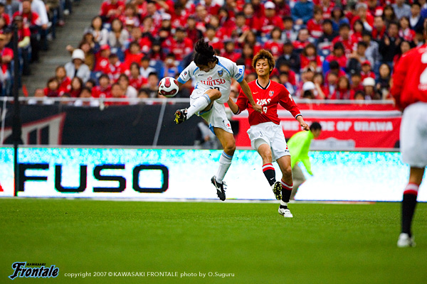 フロンターレは通常の3-5-2のフォーメーションで、右に村上、左サイドにはFWの黒津が入った。立ち上がり数十秒、速いリスタートで浦和がゴール前に迫る。タテパス1本にワシントンが走りこみ、至近距離からシュート。しかし、ここは川島の好セーブでしのぐ。ボールを回してリズムを作りたいフロンターレだが、浦和の中盤の激しいチェックに捕まり、なかなかフィニッシュまでつなげることができない。攻撃にかかるところでボールを奪われ、カウンターを浴びる苦しい試合展開が続く。10分、ようやくパスがつながり、中央突破から我那覇がゴール前に切れ込みシュートを放つが、これは浦和DFにブロックされる。さらにゴール前のルーズボールに谷口が飛び込むが、あと一歩というところでシュートを打てず。12分、浦和の攻撃。左サイドの小野が巧みにDFを交わして強烈なミドルシュート。しかし、ここはGK川島が横っ飛びで好セーブを見せる。中盤でのボールの奪い合いからシンプルにゴール前に向かう展開が続くなか、20分をすぎたあたりから浦和がボールを回しはじめる。高いテクニックを持つ小野、ポンテを中心に、フロンターレ陣内にじわりじわりと迫る浦和。27分、ワシントンのボールキープから右サイド突破され、ポンテが決定的な折り返し。このボールに永井がタイミング良く合わせるが、GK川島が驚異的な反応でゴールラインを割らせない。33分、ワシントンのポストプレーから永井が抜け出し折り返し。ここにポンテが走りこみフリーの状態でシュートを放つが、ボールはゴール右へと外れてことなきを得る。フロンターレも反撃。34分、自陣でカットしたボールをすばやくつなぎ、一気に前線へ。このボールを我那覇が粘り強くキープしながらシュートを放つが、相手GKの好セーブに阻まれてしまう。35分には箕輪のオーバーラップを起点にして、ジュニーニョとのコンビプレーに黒津が裏のスペースに抜け出すが、これは惜しくもオフサイドの判定。43分、浦和の攻撃。パスを回して左サイドへ展開し、オーバーラップしてきた阿部のクロスに永井がヘッドで合わせるが、シュートはゴール右に外れる。互いに決定機は少ないものの、レベルの高い攻防が繰り広げられる緊張感あふれる試合内容。両チームともに気持ちを前面に出した試合は、0-0で前半を折り返した。