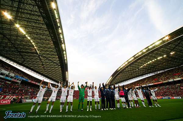 ハーフタイムのロッカールーム。「前半と同じように球際強く厳しく戦っていくぞ!」と関塚監督が選手を鼓舞。そして黒津に向かって「クロ、今度は自分が仕事をする番だ。勝負に出ろ!」と指示を送る。「みんなで心ひとつにして戦っていくぞ」という監督の声を聞きながらピッチへと出て行く選手たち。後半立ち上がり45分、伊藤の浮かし球に合わせた黒津が最終ラインの裏に抜け出すが、DFにつぶされてシュートを打てず。対する浦和も46分、左サイドの小野がフリーでボールを受けてクロスをゴール前へ。しかし、ここは寺田が足を伸ばしてボールに触りピンチをしのぐ。迎えた50分、中盤から細かくパスをつなぎ、ボールは左サイドの黒津へ。ここで黒津が勝負を仕掛けて深い位置からシュート性の折り返しのボールをゴール前へ。GKとDFの間に入ったボールに走り込んだのは我那覇。DFに体を入れられながらもスライディングで泥臭く押し込んだ先制ゴールは、待ちに待った自身今季初得点となった。(1-0) このゴールで勢いに乗ったフロンターレはさらに攻撃。53分、正面やや右寄りの位置からのフリーキック。中村のカーブをかけたシュートは惜しくもゴールわずか右に外れる。浦和も反撃。55分、リスタートのルーズボールを拾われカウンターを浴びるが、右サイドからのクロスは村上がいち早く戻ってクリア。56分には小野のコーナーキックにワシントンが飛び込むが、GK川島がパンチングでしのぐ。その流れからフロンターレの逆襲が始まる。シンプルにつないで浦和陣内へとボールを運び、ジュニーニョが左サイドで2人につかれながらも粘り強くボールをキープ。そして左足で狭い隙間を突いた鋭いクロスをゴール前へ。ここに絶妙のタイミングで走り込んだマギヌンがボールを押し込み、待望の追加点を挙げる。(2-0) しかし、ホームゲームで25試合無敗を誇る浦和も反撃を見せる。64分、コーナーキックを一度はクリアしたものの一瞬のスキが生まれ、ボールを奪い返した永井が左サイドからクロス。このボールをワシントンが頭で落とし、川島が飛び込むものの堀之内に体ごと押し込まれて1点差に迫られる。(2-1) ここからはお互いに持ち味のアグレッシブなサッカーを展開。手に汗を握る一進一退の攻防が続く。あまりにも運動量が多いために足をつる選手がフロンターレに続出。71分、両足がつった黒津に代わって井川がピッチへ。谷口も足がつり、75分に河村と交代。80分をすぎても焦らずにボールを回しながらワンチャンスを狙う浦和。83分、リスタートからのセカンドボールを拾った鈴木がグラウンダーのミドルシュート。一瞬タイミングを外されたが、川島が片手を伸ばして神がかり的なセービング。ピンチをしのぐ。87分、両足がつった我那覇に代わってテセを投入。チーム一体となって限界まで走りきり、浦和の攻撃を食い止めるフロンターレ。そして待ちに待った試合終了のホイッスルが鳴る。