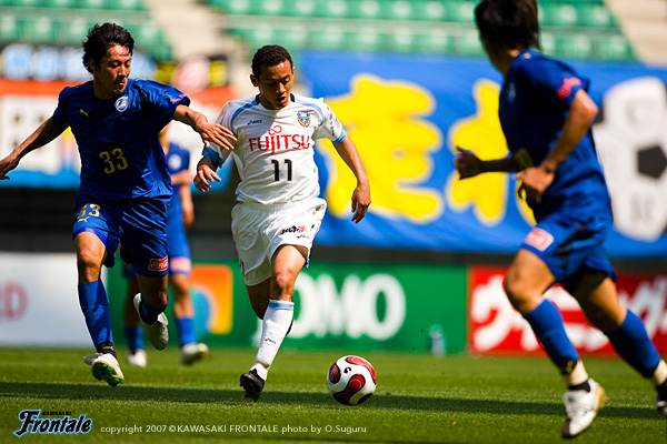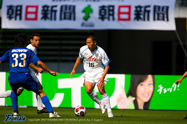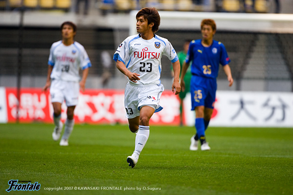 立ち上がりからマンマークの激しい守備でプレッシャーをかけてくる大分。思うような結果が出ていないなか、序盤からこの試合にかける気迫が見える。1分、早いリスタートを狙われるが、ここは寺田がカバーリングに入る。4分には根本のフリーキックがゴール前に入るが、GK川島が冷静にキャッチ。中盤でボールを奪って速攻を狙うフロンターレ。7分、ジュニーニョがドリブルを仕掛け、ひさびさの出場となった我那覇へ。トラップしながら反転してミドルシュートを放つが枠をとらえきれず。9分には右サイドから崩しをかけて中村がボールキープ。ラストパスが我那覇へ渡るが、DFに止められシュートを打てず。11分、左アウトサイドに入った黒津が強引にエリア内へ侵入するが、シュートは相手DFにブロックされる。14分、大分の攻撃。右サイドの高橋のクロスは箕輪がクリアするが、こぼれ球を根本に拾われフリーでシュートを打たれる。しかし、ここは寺田がコースに入りシュートブロック。ピンチをしのぐ。15分には、右サイドからアーリークロスがゴール前に入るが、箕輪が体を入れてシュートコースを消す。泥臭くボールに食らいつき、ロングボールを右サイドに入れてくる大分。守備の出足が大分の方が一歩早いため、中盤でボールを失うシーンが目立つ。25分、箕輪のスルーパスに森が右サイドを抜けるが、折り返しのボールはゴール前に合わず。迎えた26分、中盤でパスミスを拾われ、アウグストがドリブルを仕掛けてゴール前へ。セルジーニョとのワンツーから抜け出したアウグストに先制点を許してしまう。(0-1) 31分、我那覇クサビとなり黒津へ。パスを受けたマギヌンが左サイドを抜けるが、ラストパスをゴール前に送れず。35分には黒津が左サイドから勝負を仕掛け、こぼれ球をジュニーニョが拾うがクロスを入れられず、ラストパスが通らない展開が続く。逆に37分、大分に早いリスタートから攻め込まれ、アウグストに強烈なミドルシュートを打たれるが、ここはGK川島ががっちりキャッチ。迎えた44分、フロンターレのカウンターのチャンス。ところがジュニーニョと深谷が交錯したプレーで、ジュニーニョがファールの判定を受けてこの日2枚目のイエローカード。退場処分となってしまう。数的優位に立った大分はロスタイムに猛攻を見せるが、川島の好セーブでしのぐ。先制された上に数的不利な状況。さらにハーフタイムに関塚監督がジュニーニョの退場についてレフェリーに抗議。退席処分になってしまう。0-1で前半を折り返した。
