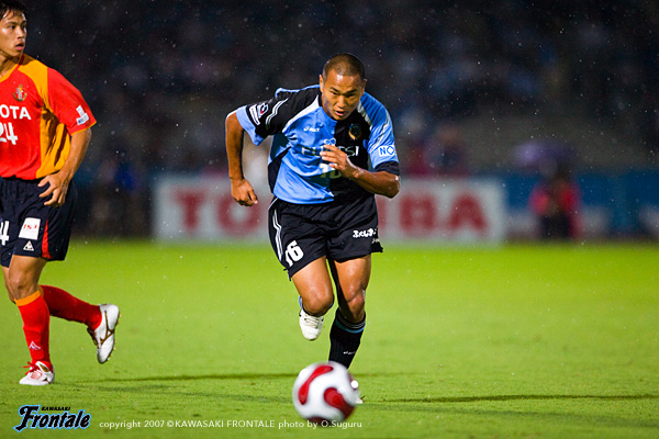 スターティングメンバーはジュニーニョとテセの2トップ、トップ下にマギヌン。右アウトサイドに森、左には黒津と攻撃的な両ワイド。中村、谷口のダブルボランチ。最終ラインは伊藤-寺田-佐原、GKに川島。名古屋は4バックでスタートするかと思われたが、この試合は3バックのフォーメーションで、完全に1対1でマッチアップする形。1分、ルーズボールを拾ったジュニーニョがドリブルをしかけて左足でシュートを放つが、うまくフィットせず。2分、早いテンポで攻撃をかける名古屋。中央から右サイドへの展開を狙われるが、黒津が戻りながらスライディングでパスカット。互いに早いリズムで攻撃をかけ合うスピーディーな試合展開が続く。8分、中央と中村からパスを受けたテセがDFと入れ替わり、裏のスペースへと抜け出し左足でシュートを放つが、うまくフィットせずGK正面。11分には中村のロングパスに黒津が左サイド深い位置で追いつき、クロスのクリアボールを拾った谷口がシュートを放つが、これは左ポスト直撃。惜しいチャンスを逃す。15分、パスミスを拾われ名古屋のカウンターを浴びるが、ここは中村が戻りケア。16分、名古屋の左コーナーキック。本田の独特な軌道のキックから混戦となるが、ボールはポストに当たりラインアウト。ことなきを得る。20分には、攻撃にかかるところを名古屋に奪われカウンター。右サイドからクロスが入り、玉田がフリーでシュートを放つが枠をとらえきれず。23分、今度はフロンターレがカウンターアタックをしかける。マギヌンのスルーパスにジュニーニョが抜け出しシュート。GKがセーブしたこぼれ球に中村が詰めてミドルシュートを放つが、ここもDFに当たりゴールならず。28分、中村→ジュニーニョ→黒津と流れるようにパスがつながり、左サイドに流れた中村が折り返し。ゴール前でボールを受けたジュニーニョが左足を振りぬくが、シュートは惜しくもゴール上に外れる。左サイドの本田を起点に、サイドで揺さぶりをかける名古屋。しかし、フロンターレも高い守備意識からボールを奪い、名古屋に攻勢をかける。36分、名古屋の攻撃。裏のスペースへのタテパスに中村直が追いつき、左サイドから折り返し。このニアのクロスに藤田が飛び込むが、GK川島が驚異的な反射神経でセーブ。しかし37分、直後の左コーナーキックにニアで玉田が飛込みヘディングシュート。GK川島が触るもかき出せず、先制点を奪われてしまう。(0-1) 38分、フロンターレの反撃。ジュニーニョがじわりじわりとバイタルエリアに詰めてミドルシュートを放つが、GK楢崎の好セーブに阻まれる。チャンス自体はフロンターレの方が多いものの、名古屋のディフェンスを崩しきれず。逆に早いタイミングでサイドへと展開する名古屋にセットプレーから失点を許し、前半を0-1で折り返した。