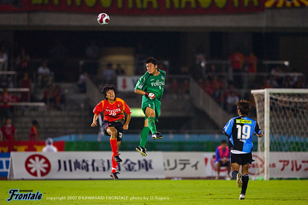 ハーフタイムのロッカールーム。「もう1度、自分たちの形を作り直して戦っていこう」と伊藤。「いけるぞ、強い気持ちをもって最後まで戦え!」と関塚監督も選手たちを鼓舞する。46分、ジュニーニョが中盤からドリブルで3人を抜いてそのままミドルシュートを放つが、これはGK正面。47分にはジュニーニョからパスを受けたテセが、囲まれながらボールキープ。後ろに出したパスにマギヌンが走りこみミドルシュートを放つが、これは枠をとらえきれず。ここからフロンターレが連続してゴールチャンスを作り出す。50分、ジュニーニョがドリブルをしかけ、パスを受けたテセがゴール前で粘り、戻したボールに合わせた黒津が右足でシュートを放つが、わずかにゴール左にそれてしまう。51分、中村を起点にダイレクトでパスがつながるが、ゴール前でシュートを打てず。52分、マギヌンの絶好のスルーパスに走り込んだ森がフリーで右サイドからシュート。しかし、この決定的なチャンスもゴール右へと外れてしまう。53分、黒津を起点にパスをつなぎ、中央のジュニーニョがフリーでミドルシュートを放つがDFにブロックされる。54分、コーナーキックのこぼれ球に詰めたマギヌンがミドルシュートを放つが、これもゴール右へと外れる。さらに56分、早いリスタートから右サイドに流れたテセからボールを受けたジュニーニョが左足でシュートを狙うが、ここもGK楢崎にセーブされる。連続して決定的な場面を作るものの、ゴールが遠いフロンターレ。逆に名古屋の反撃を受ける。58分、名古屋がコーナーキックから攻勢。ゴール前で連続してシュートを打たれるが、ここはディフェンス陣が何とかしのぐ。59分、フロンターレの攻撃。右サイドから中村を起点にパスをつなぎ、黒津がフリーでミドルシュートを放つがGKがセーブ。中村のコーナーキックにテセがドンピシャリのタイミングでヘディングシュートを放つが、ここもGK楢崎の好守に阻まれてしまう。61分、佐原に代えて井川を投入。そのまま最終ラインに入る。63分、名古屋のカウンターアタック。4対3と決定的なピンチを招くが、ここは最終ライン3人と谷口で名古屋の攻撃をしのぐ。66分、テセに代わり我那覇がピッチへ。68分、名古屋が早いリスタートからゴール前にアーリークロス。しかし、ここは井川が体を張ってカバー。この場面で井川と交錯した本田が2枚目のイエローカードをもらい退場となり、この判定に異議を唱えたフェルホーセン監督も退席。フロンターレが数的優位な状況になる。74分、谷口に代えて大橋が入り、マギヌンとのダブルトップ下に。完全に引いてゴール前を固める名古屋からゴールを狙う。79分、中村スルーパスを受けた黒津が左サイドから折り返し。ゴール前で我那覇が粘り、反転して左足でシュートを放つが、惜しくもゴール上へと外れる。フロンターレが押し込み、名古屋がクリアをする展開が続く。82分、井川のスルーパスに森が抜け出し、右サイドから折り返し。しかし、パスを受けたジュニーニョがDFに詰められシュートを打てず。89分、森が勝負をかけて右サイドを深くえぐりクロス。ファーサイドで黒津がダイレクトで合わせるが、ここもブロックされてゴールラインを割れず。名古屋に時間を使われながらかわされ、嫌な空気が流れる。しかし、迎えたロスタイム突入間近。井川が遠目から積極的に放ったミドルシュートがジュニーニョの足元に飛び、コースを代えたボールがゴールネットに吸い込まれる。(1-1) このゴールで試合の流れは一気にフロンターレへと傾くが、ロスタイムの5分間攻め続けるものの勝ち越しゴールを奪えず。試合は1-1のままタイムアップ。収穫と課題の両面が浮き彫りになったゲームとなった。