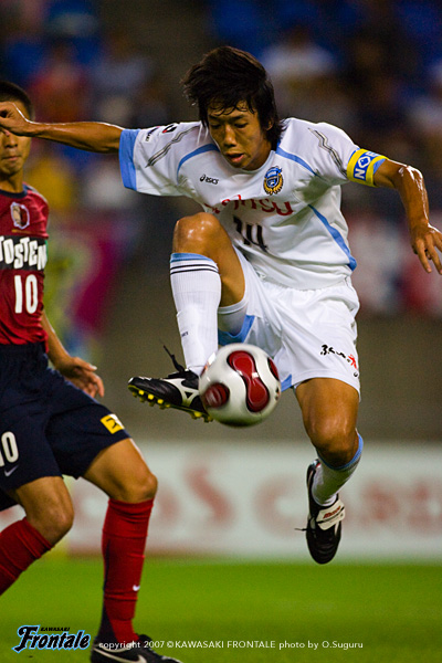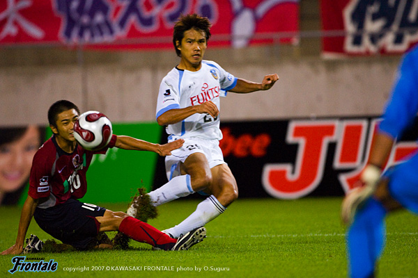 スターティングメンバーはジュニーニョとテセの2トップ、トップ下にマギヌン。右ワイドに森、左には村上、最終ラインは伊藤-寺田-箕輪、GK川島。立ち上がり数十秒、伊藤がロングボールを最終ライン裏のスペースへ。ここに谷口が抜け出し左サイドから左足で狙うが、シュートはゴール左へと外れる。激しいマークで2トップにプレッシャーをかけてくる鹿島。5分、接触プレーの影響で箕輪がピッチ外に出ているところを鹿島に狙われる。細かなパスワークから新井場が左サイドから中央へと切れ込むが、ゴール前で村上がクリア。ピンチをしのぐ。7分、最終ライン裏へロングボールを出されるが、ここは箕輪がケア。10分、フロンターレの攻撃。セカンドボールを拾ってパスをつなぎ、ジュニーニョが中央からミドルシュートを放つが、これはGK正面。11分、鹿島の攻撃。右サイドを崩されて中央に切れ込んだ内田にシュートを打たれるが、GK川島が好セーブでしのぐ。両サイドバックが高い位置を取り、積極的に攻撃をしかける鹿島が試合を優勢に進める。フロンターレも15分、16分と連続してコーナーキックを取るが、いずれも鹿島DFにクリアされる。20分、マギヌンが中盤で鹿島ボールをインターセプト。その流れからカウンターを狙うが、あと一歩というところでシュートまで持ち込めず。迎えた21分、フロンターレに決定機が巡ってくる。谷口が体を入れて奪ったボールを、中村が瞬時に裏のスペースへ。ここに走り込んだテセが相手GKを引きつけ、右サイドの深い位置から折り返し。このボールを後ろから走り込んだマギヌンが流し込むが、ゴール前でDFがクリア。さらにこぼれ球をジュニーニョが押し込もうとするが、このシュートを外してしまう。25分には、ジュニーニョが左サイドへ展開。パスを受けた村上が中央に切れ込みミドルシュートを放つが、ここはDF陣にブロックされる。26分、鹿島の攻撃。小笠原を起点にシンプルにパスをつながれ、野沢にミドルシュートを打たれるが、これはゴール右へと外れる。互いに速い攻撃を仕掛けあい、ボールが落ち着かない展開が続く。そんな中で迎えた30分、鹿島がペナルティーエリア前絶好の位置からのフリーキック。ここで野沢に直接シュートを決められ、先制点を奪われてしまう。(0-1) さらに37分、ロングボールのルーズボールを拾った小笠原に左足の見事なミドルシュートを決められ、2点差をつけられてしまう。(0-2) 攻守の切り替えが早く、ボールのないところでの運動量の多い鹿島が試合を優位に進め、数少ないフィニッシュの場面では個人の技術の高さを見せて2点。対するフロンターレは鹿島の攻撃を受けに回る形となってしまい、攻撃もいまいちかみ合っていないように見える。前半で2点のビハインドと、苦しい展開で前半を折り返した。