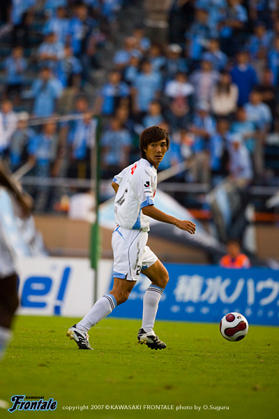 フロンターレのスターティングメンバーは、2トップにジュニーニョと黒津、トップ下には大橋、右アウトサイドに森、左に村上、中村と谷口のダブルボランチ、伊藤-寺田-箕輪の最終ライン、GK川島。通常とは逆のピッチからキックオフ。立ち上がり1分、横浜FCのフリーキック。三浦淳が直接狙うが、このシュートはゴール左へ外れる。2分、フロンターレの攻撃。中村のロングパスが裏のスペースへ。ここに黒津が走り込むが、GK菅野が飛び出し抑えられる。8分、横浜FCのコーナーキックをしのいでカウンターへ。中村からパスを受けたジュニーニョが右サイドでドリブル突破。折り返しのボールを入れるが、ゴール前に飛び込んだ谷口、黒津にはわずかにタイミングが合わず。横浜FCはセットプレーからチャンスを伺うが、ゴール前を固めて堅実にクリアしていく。13分、フロンターレのセットプレーのチャンス。中央から大橋が直接シュートを狙うが、ここは惜しくもGK菅野の好守に阻まれる。14分にはコーナーキックのセカンドボールを拾って押し込み、右サイドに流れた中村の折り返しのボールにジュニーニョが飛び込むが、このシュートは惜しくもフィットせず。ときおりイージーミスから横浜FCに反撃を浴びるものの、横浜FCの拙攻にも助けられる。20分以降はお互いに相手の出方を伺いながらボールを回す小康状態が続く。すると迎えた26分、フロンターレが勝負をかける。中央の黒津から右サイドに流れたジュニーニョへと展開。折り返しのボールを受けた谷口が左サイドに流れた大橋とのコンビネーションでディフェンス陣を翻弄。スペースに抜けた大橋が至近距離からシュートを放つ。これは相手GKに弾かれるものの、こぼれ球をジュニーニョが体で押し込み、ひさびさの先制点を挙げる。(1-0) さらに勢いに乗るフロンターレは27分、ジュニーニョがドリブルで勝負を仕掛けてゴール前の黒津へ。しかし、これはわずかにタイミングが合わず、シュートには持ち込めず。29分には、ジュニーニョから右サイドへと展開。パスを受けた森が勝負を仕掛けて左足でクロス。ゴール前に走り込んだ黒津がヘッドで合わせるが、シュートはわずかにゴール上へと外れる。その後はお互いに動きがない時間帯が続くが、横浜FCも徐々に反撃。39分、パスをインターセプトされてカウンターを浴びるが、マルコスパウロのミドルシュートはゴール上へと外れる。さらに40分、三浦知から左サイドに流れたカタタウにボールが渡るが、この場面は箕輪がスライディングでカバー。ロスタイムにフロンターレに反撃。セカンドボールを拾って横浜FC陣内へと押し込み、右サイドに流れたジュニーニョからクロス。ファーサイドでボールを受けた大橋が中央へと切れ込みシュートを放つが、これはGK正面。フロンターレが一瞬のチャンスをきっちりとものにして、その後はセーフティーな試合運びを進め、前半を1-0で折り返した。