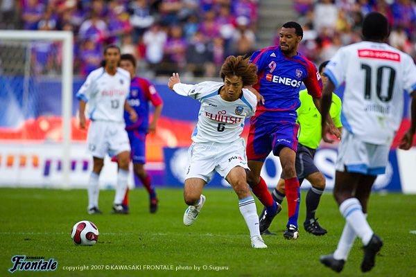 この日のスターティングメンバーは2トップにジュニーニョとテセ、2列目は前目にマギヌン、中盤右に谷口、左に中村、中盤底に河村が入り、左から伊藤-佐原-箕輪-森で最終ラインを形成、GK川島。攻撃時には4-4-2の中盤ダイヤモンド型、守備時にはFC東京の4-2-3-1に合わせてテセが相手の左サイドバックをケアする4-1-4-1に近いフォーメーションでスタート。立ち上がり1分、FC東京の攻撃。今野が左サイドに流れてドリブル突破をしかけるが、ここは河村が身を挺してカバーに入る。4分、フロンターレの攻撃。リスタートの流れから箕輪のロングキックを谷口が頭ですらし、テセが後ろ向きでトラップして振り向きざまにシュート。しかし、これはGKにキャッチされる。4バックでサイドのスペースを消し、その前で河村がルーカスをマーク。堅実なディフェンスを展開するフロンターレ。6分、鈴木規へのロングボールにも森がしっかりとついてクリア。7分、フロンターレの攻撃。右サイドの森からパスを受けたテセが右サイド深い位置からマイナスの折り返し。ここに走り込んだマギヌンがミドルシュートを放つが、これは枠には飛ばず。ロングボールを入れてセカンドボールに圧力をかけるFC東京に対し、箕輪、佐原、そして河村が中央を固める。14分、互いにチャンスは作るが、ゴールの匂いがするのはフロンターレか。24分、波状攻撃をかけてFC東京がボールを持ち込み、赤嶺がシュートを放つが、これは箕輪がブロック。このこぼれ球も伊藤がクリアし、ゴールを守る。すると25分、ゴール前の混戦からテセがやや右の角度からおもいきって左足を振り抜き、このシュートがネットに吸い込まれ、フロンターレが先制点を上げる。(1-0) 続いて29分、右サイドのジュニーニョからのボール、エリア内混戦の中、テセが倒れたままボールを押し込み2点目。(2-0) その後はFC東京がシンプルな攻撃でゴールを狙うが、堅実なディフェンスでしのぐ時間帯が続く。36分、自陣でFC東京ボールを拾った中村がカウンター一発。ロングスルーパスにジュニーニョが走り込むが、惜しくもクリアされる。すると40分、右サイドのショートコーナーから、マギヌンがアーリー気味のクロスを右サイドからゴール前へ。このコースに箕輪が飛び込み、ボールはゴールへと吸い込まれる。(3-0) さらに42分、ルーズボールを拾ったマギヌンのスルーパスに、右サイドへ流れたテセが反応。角度のないところからおもいきってシュートを放ち、これが左ポストに当たってゴールネットを揺らす。(4-0) その後はFC東京も反撃を試みるが、中盤でボールを奪われてもディフェンス陣が気持ちのこもったプレーを前面に出して的確にケア。4-0という大差をつけて前半を折り返した。
