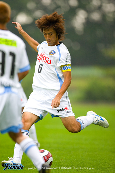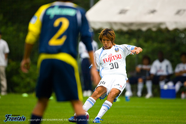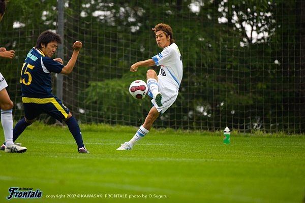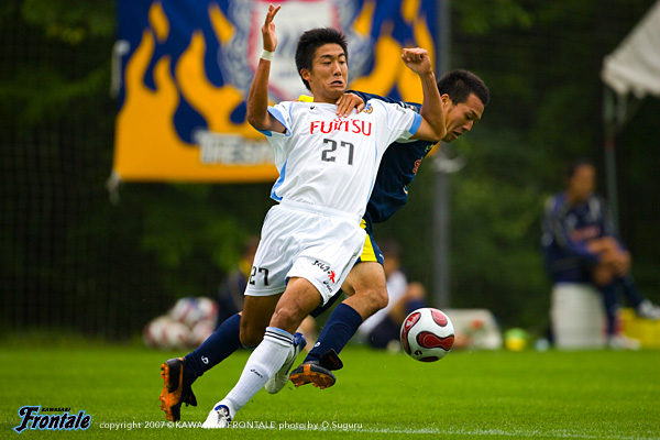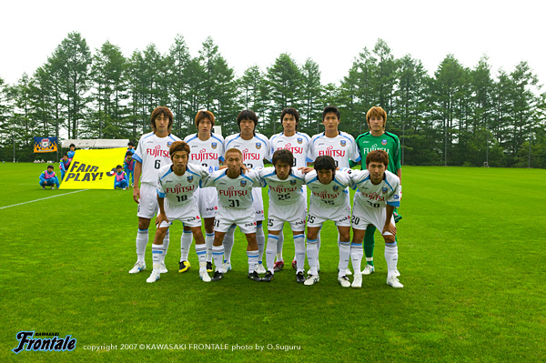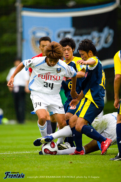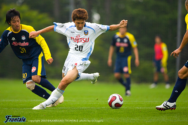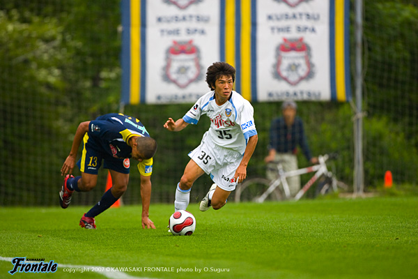フロンターレのスターティングメンバーは、都倉と黒津の2トップ、右サイドに田坂、左サイドに西山。河村と養父のコンビが中盤センターを務め、最終ラインは鈴木-薗田-大久保-飛弾、GK植草。フォーメーションは4-4-2。立ち上がりから積極的にプレスをかけて試合のリズムを取る草津。両サイドの選手が高い位置をとり、ボールを奪うとタテへの早いパス回しでゴールを狙う。8分、フロンターレの攻撃。鈴木が自陣でインターセプト。ドリブルをしかけて右サイドへ展開。しかし、田坂のクロスは惜しくもゴール前に合わず。13分には速攻から田坂がドリブルで相手を抜き去り折り返し。ゴール前に黒津詰めるが、シュートはブロックされる。さらに草津陣内で田坂がボールカット。パスを受けた黒津が強引にDFを抜き去りシュートを放つが、これもバーに当たり外れる。17分にもコーナーキックのチャンスを得るが。養父のキックに合わせた大久保が豪快なダイレクトボレーでゴールを狙うが、うまくフィットせず。左右に振ってサイドを中心に攻撃狙うが、ラストパスをはね返される展開が続く。35分、カウンターから決定的なチャンス。都倉のボールキープから3対2の数的有利の場面を作るが、この決定機も決めきれず。河村、GK植草を中心に声をかけ合いながら守っていたフロンターレだったが、前半終了間際、ゴール前で草津FWとGK植草がクロスプレーで交錯。植草が負傷して治療した後、しばらくのインターバルがあっての草津のコーナーキック。このロスタイムのセットプレーをFW奥山にヘッドで決められ、先制点を許してしまう。草津がやや試合を押し気味に進めて0-1で前半を折り返した。