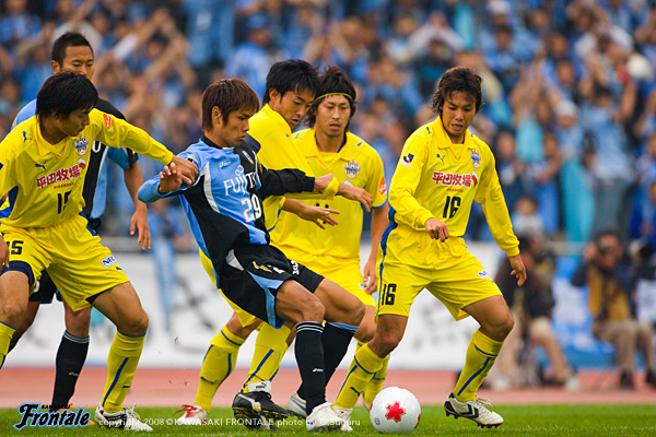17分には中村が大きくサイドチェンジ。ボールを受けた森が右サイドからクロス。ゴール前でレナチーニョがヘッドで合わせるが、シュートは惜しくもゴール左に外れる。しかし19分、伊藤が左サイドをオーバーラップ。パスを受けたジュニーニョが、中にいくと見せかけて左を回ってクロス。ファーサイドでフリーの谷口がヘッドで合わせ、角度のないところからシュートを決めて同点に追いつく。(1-1) さらに攻撃を繰り出すフロンターレ。21分、中村のインターセプトからテセのスルーパスにジュニーニョが抜け出し左足を振り抜くが、シュートはGK正面。さらにボールをつないで伊藤からラストパスを受けたテセが反転してシュートを狙うが、惜しくもGKに止められる。23分、山形の攻撃。速攻を狙うフロンターレからボールを奪い、逆にカウンターへ。ゴール前にボールを運ばれるが、GK川島がシュートセーブ。ことなきを得る。28分、フロンターレの決定機。中村のコーナーキックにテセがヘッドで合わせるが、うまくミートできず枠を外れる。34分には、中村のロングボールを受けたレナチーニョが、左サイドでDFをかわして切れ込みシュート。しかし、ここはGKにキャッチされる。37分には、GKのキックミスをテセが拾ってボールをつなぐが、フィニッシュには届かず。さらに39分、ジュニーニョの左サイドからのクロスをレナチーニョがうまく体を使ってトラップからシュートを放つが、GKの好セーブに阻まれる。迎えた43分、ルーズボールを谷口が拾い、中村がスルーパス。レナチーニョが走り込み、こぼれ球を受けたヴィトールが、左サイド角度のないところからシュートを決める。(2-1) 立ち上がりは山形の攻勢を受けてしまったが、徐々に自分たちのリズムを作り、前半のうちに勝ち越しに成功。2-1のスコアで前半を折り返した。